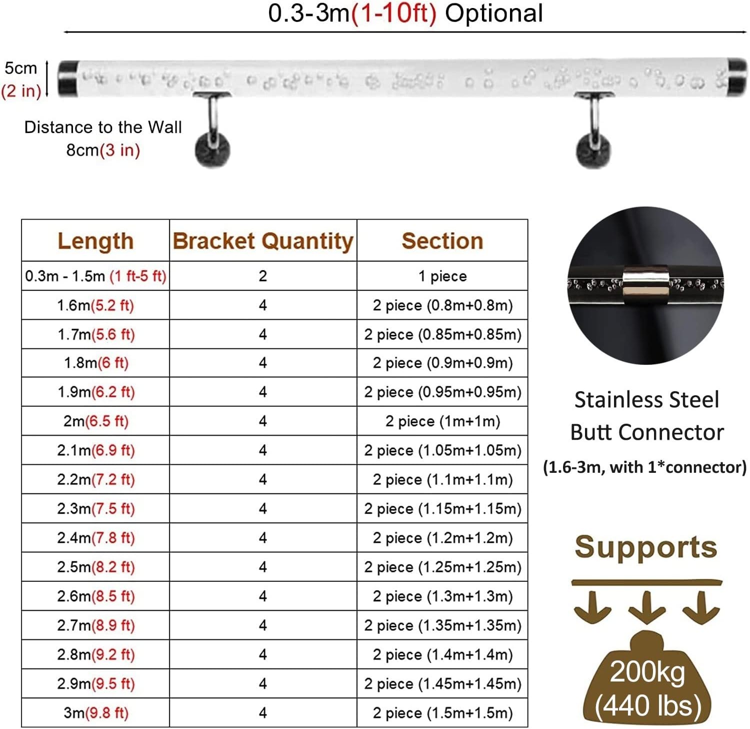 Do you find it difficult to walk up the steep, slippery or inconvenient steps in your home or porch stair? Are you on the lookout for a reliable stair railing stem for your interior or exterior steps?The hold tight handrail will be a very practical product if you have children, older folks or people who need extra help walking up & down stairs in the home. Only a small investment will make a big difference. Hand railings for stairs indoor, suitable for garage or basement steps, hallway stairway or porch step. Can be pretty straight forward to install and change places.● Specifications:Material: AcrylicDistance to the Wall: 8 cm(3 inch)Load Bearing: 200kg(440 lbs)Length: 0.3m(1ft) , 0.5m(1.6ft) , 0.6m(2ft) , 0.7m(2.3ft) , 0.8m(2.5ft) , 1m(3.2ft) , 1.2m(3.9ft) , 1.4m(4.5ft) , 1.5m(5ft) , 1.6m(5.2ft) , 1.8m(6ft) , 2m(6.5ft) , 2.2m(7.2ft) , 2.4m(7.8ft) , 2.6m(8.5ft) , 2.8m(9ft) , 3m(9.8ft)● Features:Carefully polished rounded edges keep you safe.Our staircase handrail just need 10 minutes to install by yourself.Design of our handrail is ergonomic, easy-grip and fit your palm very well.The bracket of the handrail is fixed with heavy-duty bolts, which can be used with confidence.This railing provides additional security when you enter and leave the home, especially when carrying items such as groceries, parcels and trash.● Package Included:1 x Handrail with Hardware●Tips:Please measure the length of the handrail you need accurately before installationThe product is divided according to the length:30cm - 150m (1ft-5ft) handrail is 1 section.160cm - 300cm (5.2ft - 9.8ft) handrail is 2 section.