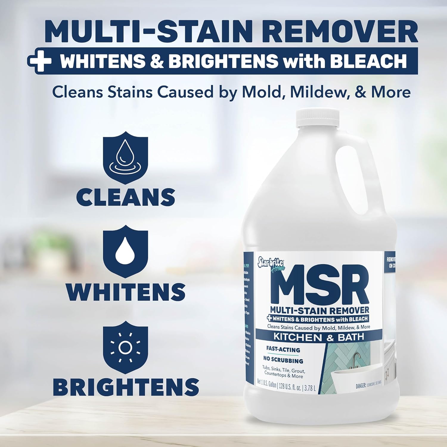 STAR BRITE Home MSR Multi-Stain Remover is your go-to cleaner for tough household stains. This fast-acting bleach formula deep cleans and whitens surfaces, removing scum and grime from tubs, tiles, sinks, grout, and countertops without scrubbing. Designed for use on hard, non-porous surfaces, it leaves your kitchen and bathroom fresh, bright, and spotless. Ideal for busy households seeking an effective and easy-to-use cleaning solution.