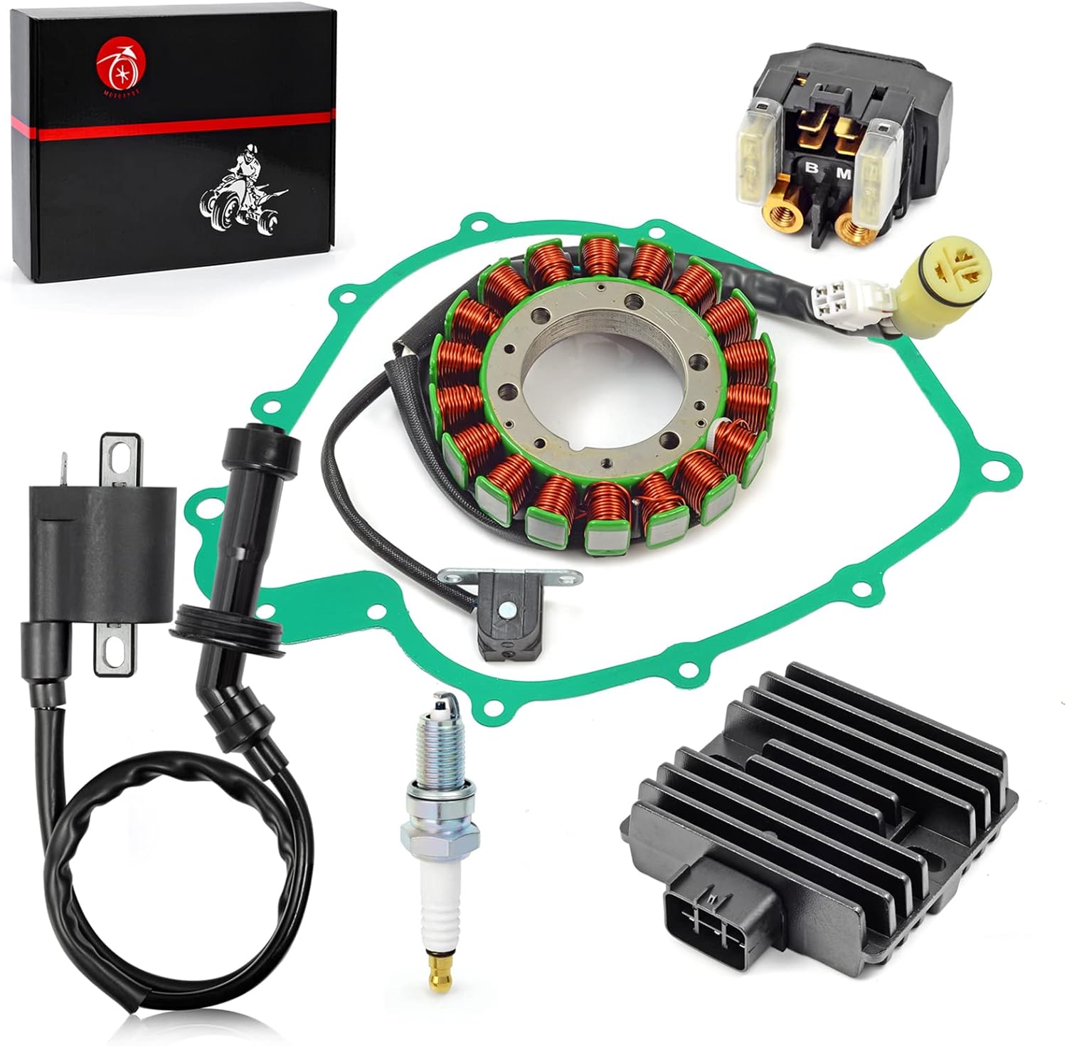 Package: 1 x Stator 1 x Regulator 1 x Gasket 1x Ignition Coi 1x Starter Relay 1x Spark Plug Manufacturer Part: 5KM-81410-01-00 5BN-81960-00-00 5KM-15451-00-00 3YF-82370-00-00 4SV-81940-12-00 This Accessories fits the following models: For Yamaha Grizzly 660 YFM660FA 4x4 2008 For Yamaha Grizzly 660 YFM660FG 4x4 2007 For Yamaha Grizzly 660 YFM660FA 4x4 2006 For Yamaha Grizzly 660 YFM660FA 4x4 2005 For Yamaha Grizzly 660 YFM660F 4x4 2004 For Yamaha Grizzly 660 YFM660F 4x4 2003 For Yamaha Grizzly 660 YFM660F 4x4 2002 For Yamaha Rhino 660 YXR660 2004-2007