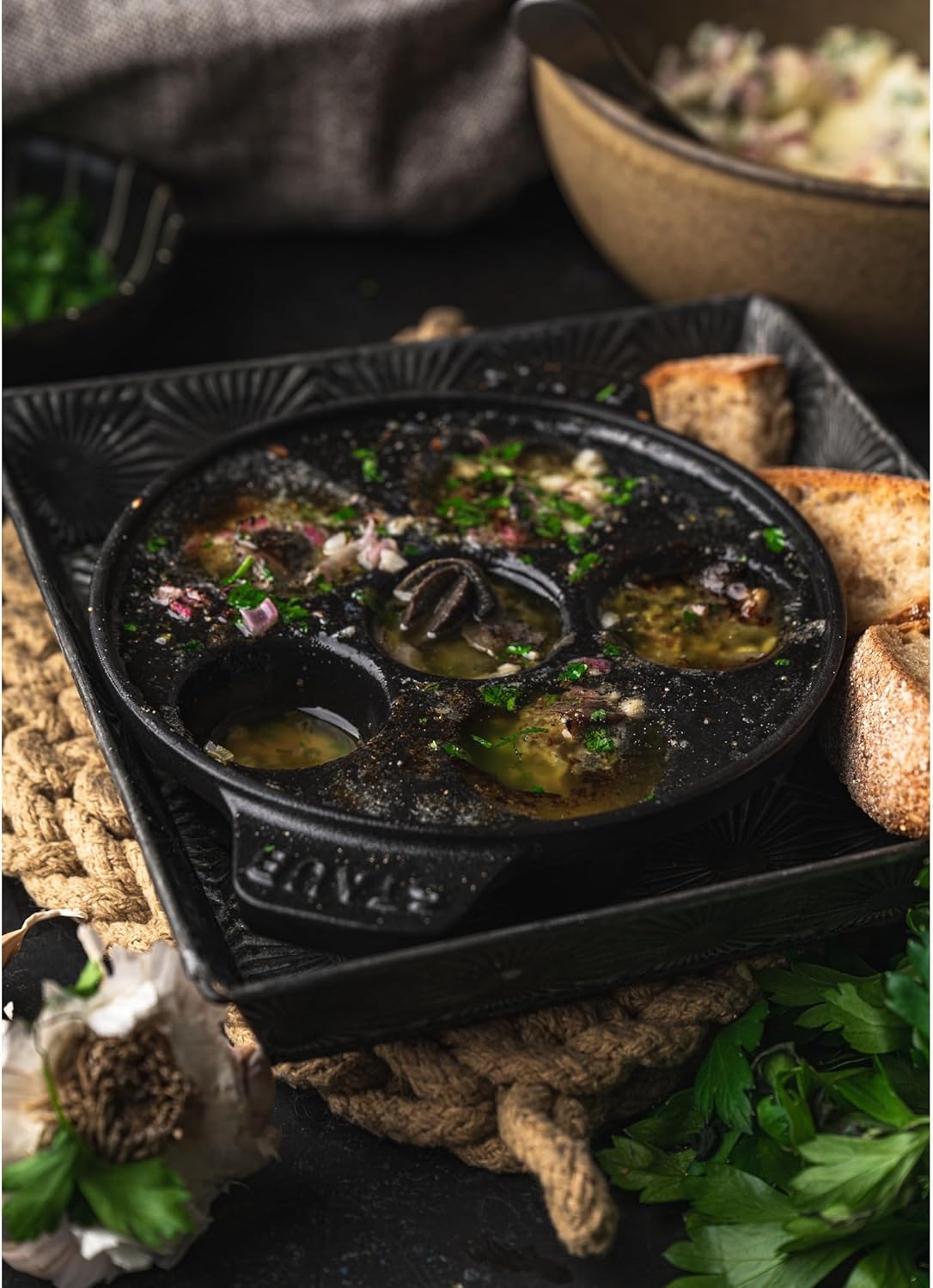 Made in France. Oven Safe up to 500F. Brass knob. Smooth enamel bottom works on all stovetops. Each piece is one of a kind. Rough texture results in exceptional browning. Requires no seasoning. Dishwasher safe dimensions: 7.6 X 5.8 X 1.4