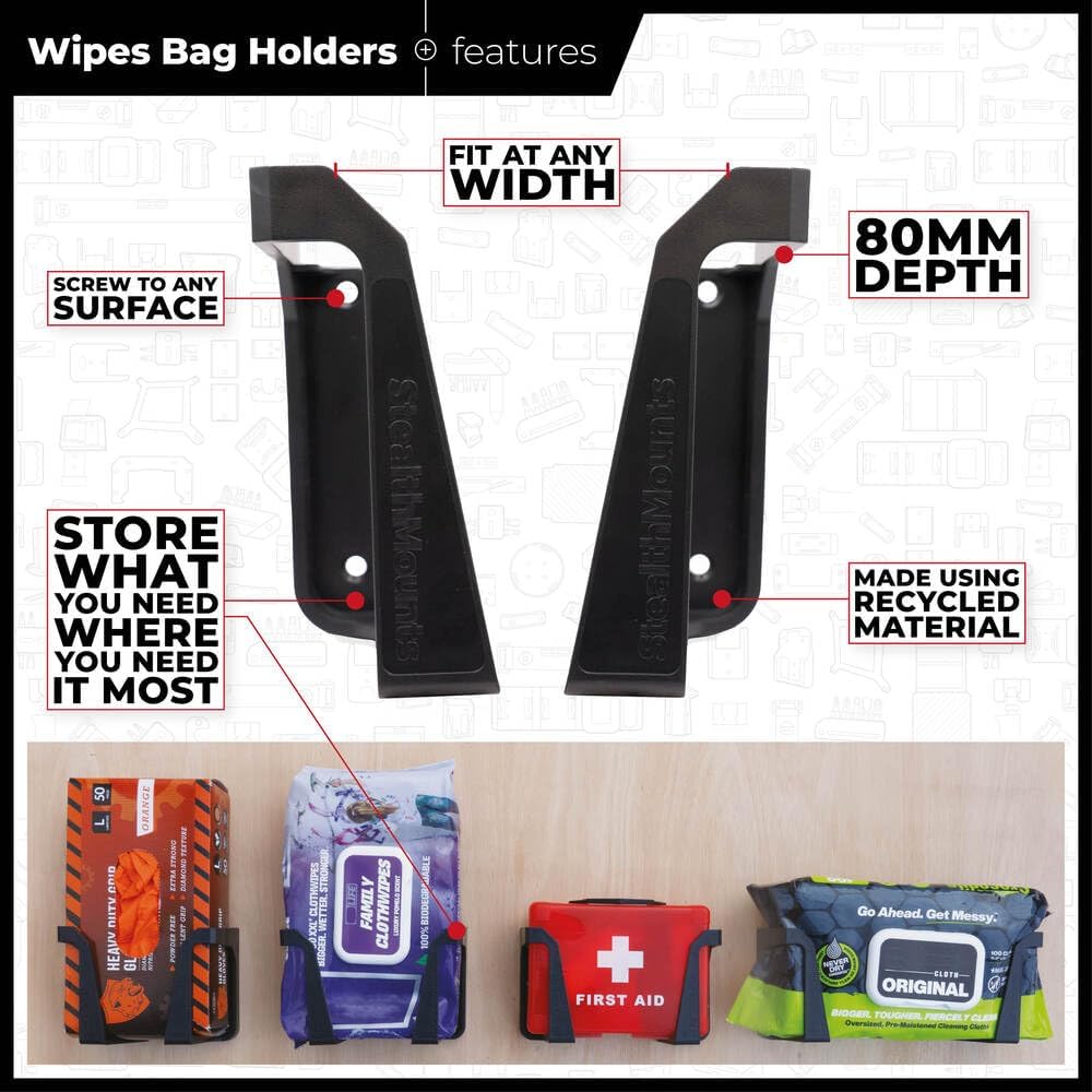 StealthMounts Magnetic Wipe & Glove Holders are universal holders designed to fit boxes up to 80mm (3 ⁵/₃₂") deep. Compatible with various brands, these holders keep wipes or gloves conveniently within reach on any metal surface in your workshop. Their strong, rubber-coated magnets hold the wipes securely without damaging surfaces. Each pack includes 1 set of Magnetic Wipe & Glove Holders. Proudly made in Great Britain, they are crafted from tough, injection-molded ABS plastic. Manufacturers website