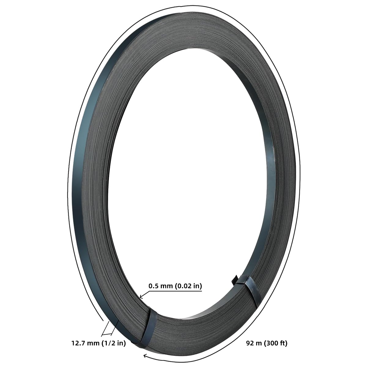 Steel strapping coil 1/2” Wide, 30 0ft x 0.02", Black Packaging Steel Strapping Roll, 1500 lbs Break Strength, Tensile Strength for Heavy Loads, Pallet Strapping Specification: Material: metal Finish: grilled Blue L x W x Thick: 92 m(300 ft) x 12.7 mm(1/2") x 0.5 mm(0.02") Break Strength: 1500 lbs Packing list: 1 x Steel strapping coil 1/2 in wide