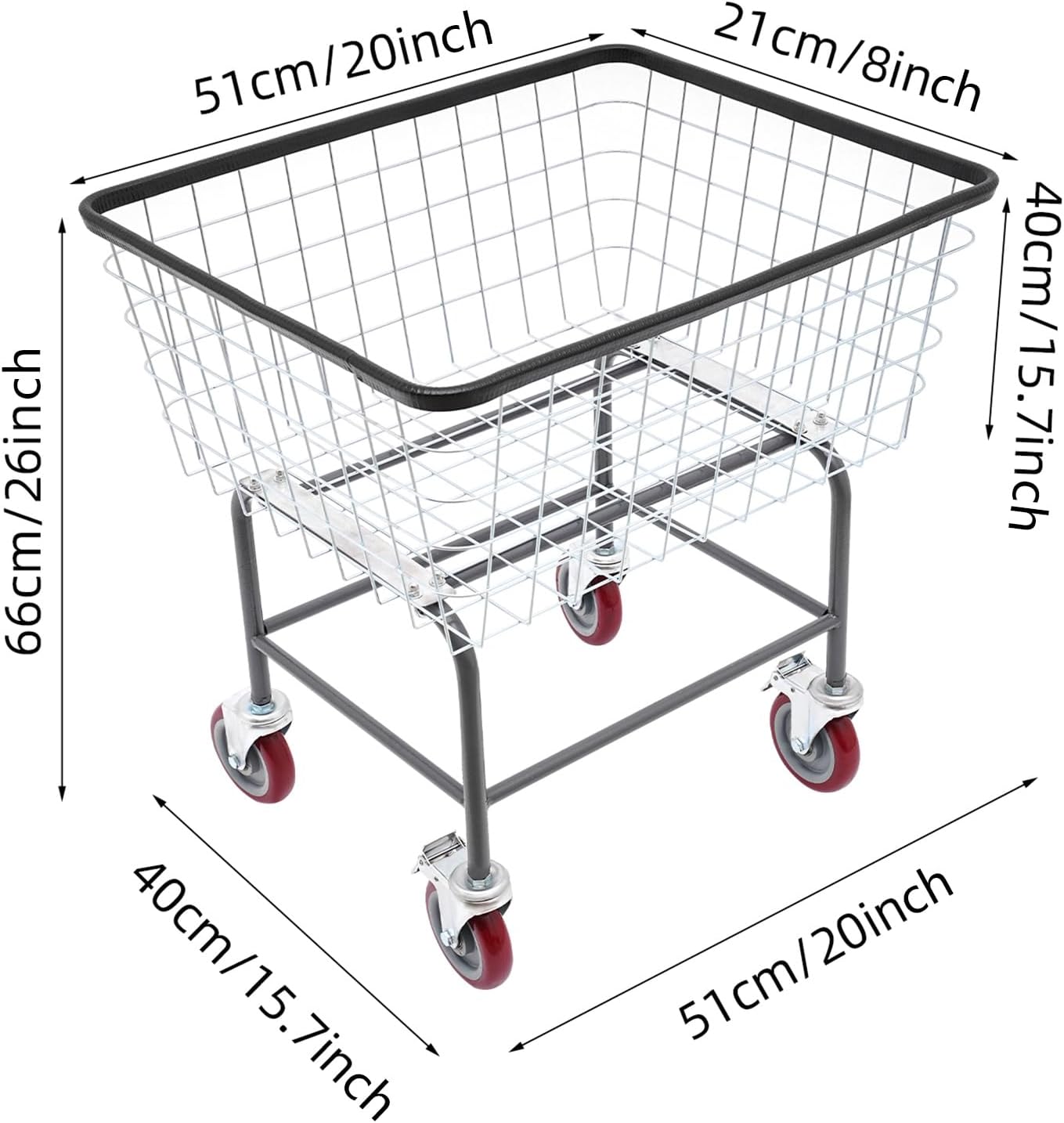 DetailsRubber Edge: It can better take care of your clothing and skin during assembly and use.Removable Basket: The basket can be easily disassembled to carry your items or use it to organize other items.ApplicationIt is suitable for homes, hotels, bathrooms, and commercial laundries for transporting clothes, towels, food, tools, and so on. It can also be used as an organizer to store toys, books, and sundries to make the room more tidy.SpecificationColor: Black, Red, SilverMaterial: Steel Wire, Steel Tube, Rubber and NylonProcess: Galvanized and Plastic SprayingAssembly Required: YesStyle: ModernShape: RectangularNumber of Universal Wheels: 4(2 With Brakes)Mount Type: Free StandingLoad Capacity: 50kg/110lbsGross Weight: 10kg/22lbsNet Weight: 9.5kg/20.94lbsPackage Size: 59*56*30cm/23.23*22.05*11.81inProduct Size: 51*40*66cm/20*15.7*26inEach Wheel Diameter: 10.16cm/4inBasket Size: 51*21*40cm/20*8*15.7inPackage Included1* Laundry Cart4* Universal WheelsOther Accessories for UseNotes1.Please note that this product does not contain any clothing.