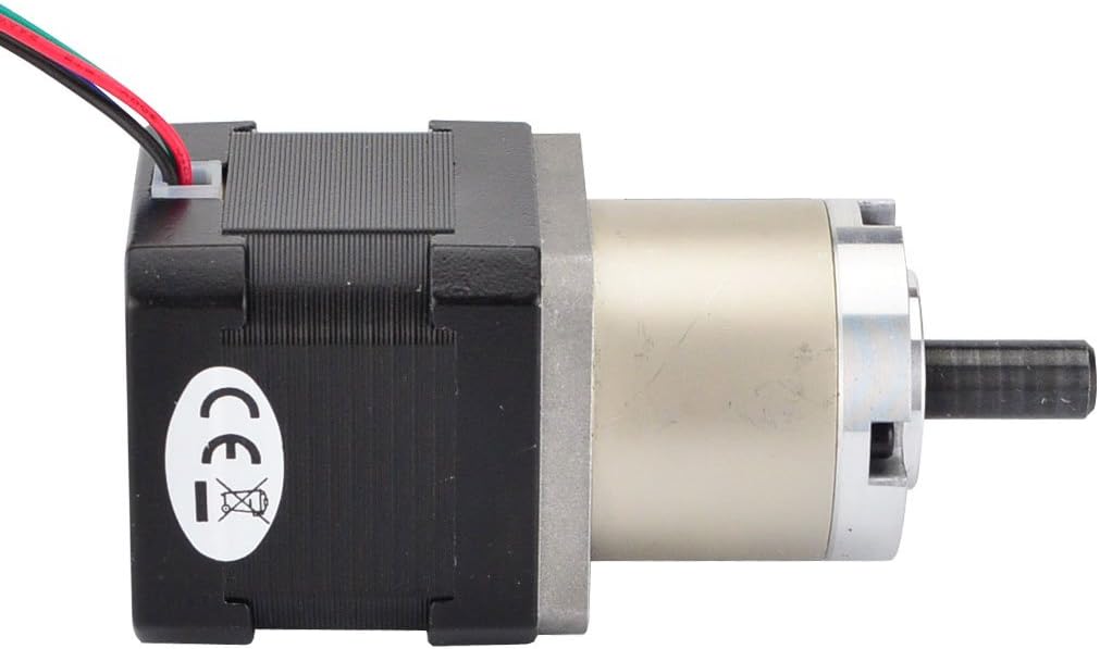 This is popular geared Nema 17 stepper motor with a medium body and torque. It has an integrated planetary gearbox with a 26.85:1 gear ratio, the resolution reach 0.067deg step angle. It's a good solution in applications that need very low rotation speeds and/or lots of torque. Electrical Specification * Manufacturer Part Number: 17HS15-1684S-PG27 * Motor Type: Bipolar Stepper * Step Angle: 0.067deg * Holding Torque: 3Nm * Rated Current/phase: 1.68A * Phase Resistance: 1.65ohms * Recommended Voltage: 12-24V * Inductance : 3.2mH±20%(1KHz) Gearbox Specifications * Gearbox Type: Planetary * Gear Ratio : 26.85:1 * Efficiency: 81% * Backlash at No-load :1deg * Max.Permissible Torque: 3Nm(425oz-in) * Moment Permissible Torque: 5Nm(708oz-in) * Shaft Maximum Axial Load: 50N * Shaft Maximum Radial Load : 100N Physical Specifications * Frame Size: 42 x 42mm * Motor Length: 40mm * Gearbox Length: 35mm * Shaft Diameter: 8mm * Shaft Length: 20mm * D-cut Length: 15mm * Number of Leads: 4 * Lead Length: 500mm * Weight: 510g Connection: Black(A+), Green(A-), Red(B+), Blue(B-) Warning: Make sure the motor connect to a constant current or chopper drive controller before you test motor. Connecting the motor directly to a power supply will destroy the motor.