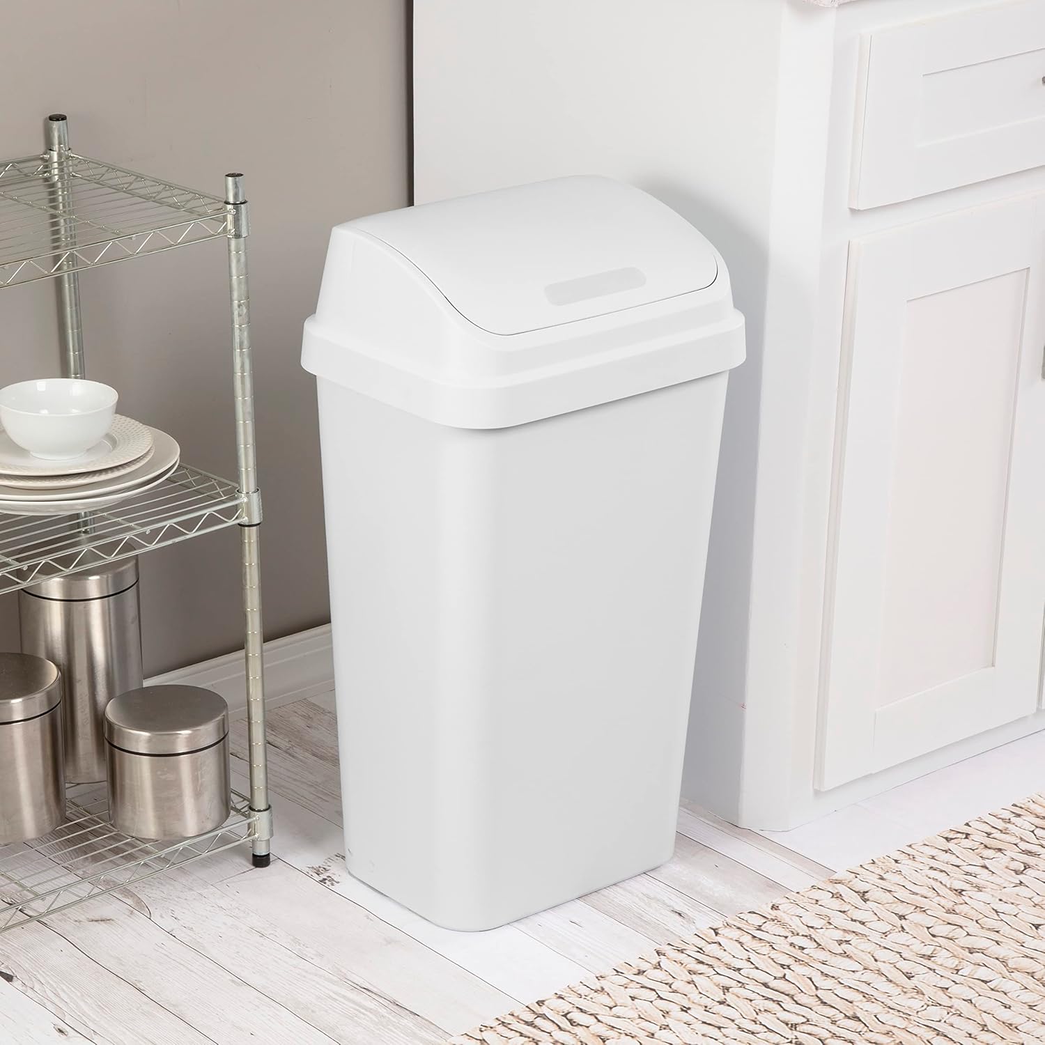 The Sterilite 13 Gallon SwingTop Wastebasket features a new look on a proven feature. The modern design, square profile and sleek lines will compliment any home décor. The swing-top feature allows the lid to swing open when lightly pushed down for easy one handed disposal. The back of the lid features an integrated handle that allows the user to lift the lid to the open position and lock it into place for easier disposal of larger items. When using this swing top feature, the lid is able to fully swing open, even when flush against a wall or cabinet. The 13 Gallon SwingTop Wastebasket is an ideal solution for larger areas of the home such as the kitchen, garage or workspace and its space efficient shape fits perfectly against a wall or a cabinet. It accommodates a standard 13-gallon trash liner and is designed with an easy-to-clean textured finish. The overall assembled dimensions of this item are 17 1/4" L x 13 1/2" W x 27 1/4" H.