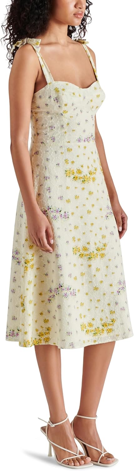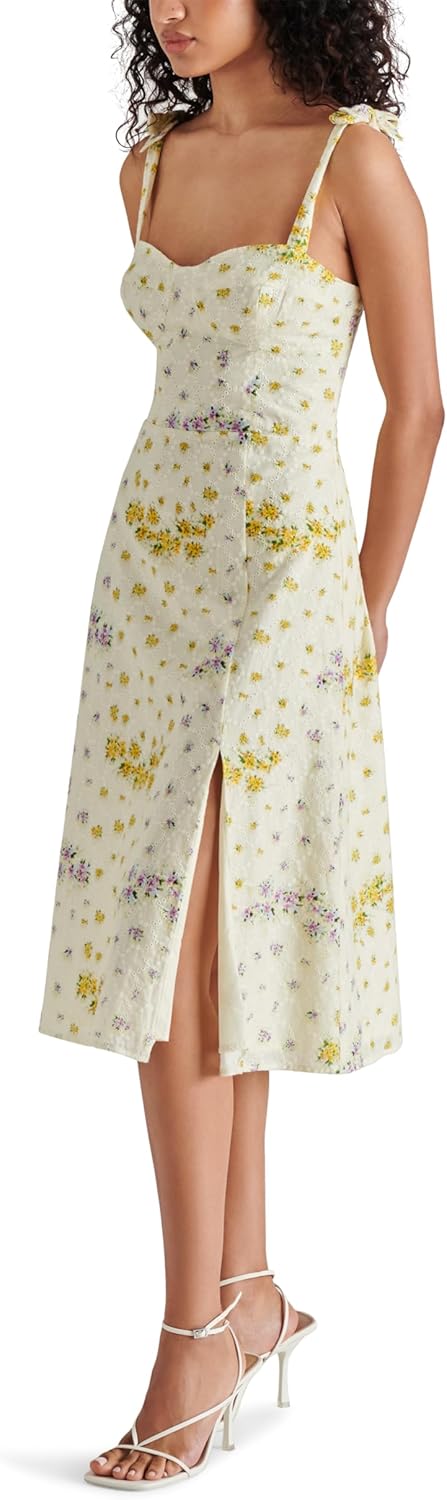 Here's one for your spring moodboard: the Carlynn Dress. This cotton eyelet stunner, complete with a smocked back bodice, tie straps, and sultry front slit, saunters into your wardrobe serving a midi-length slice of sleeveless elegance.