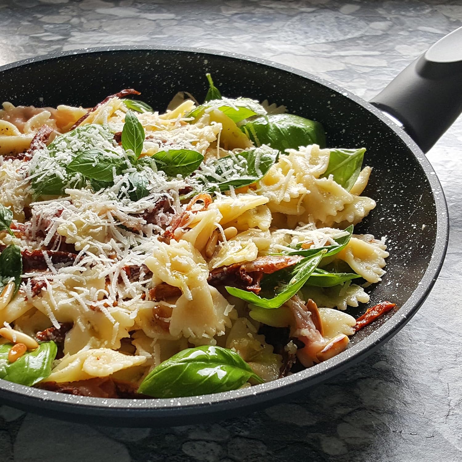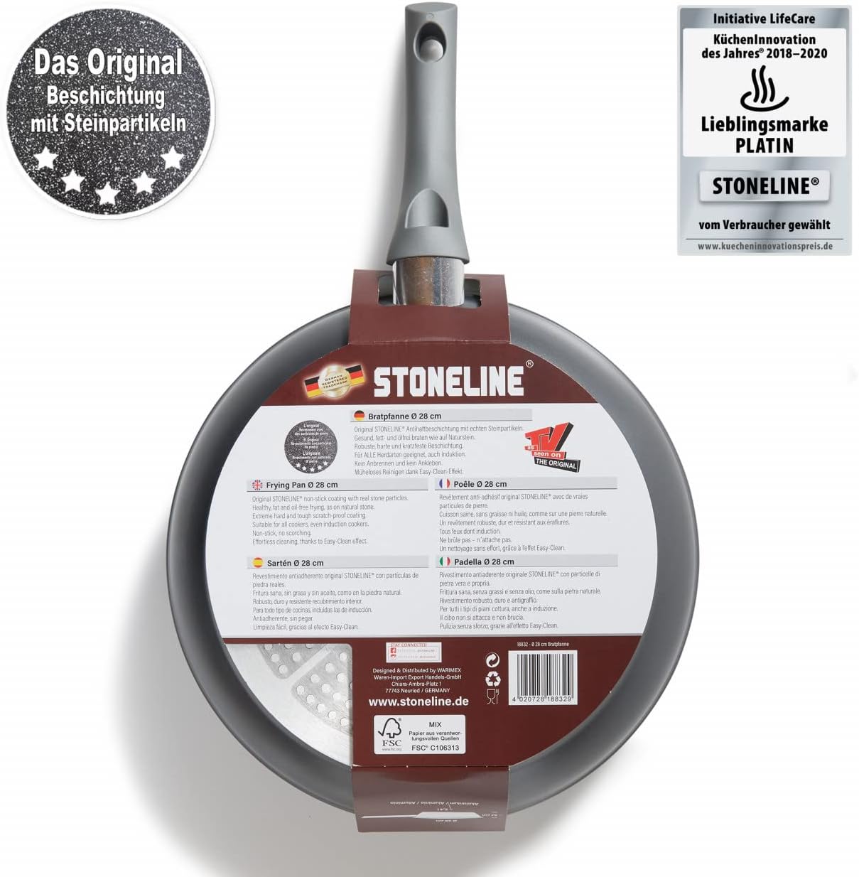 STONELINE – The original. - 28 cm frying pan. A modern design in combination with ergonomic soft-touch handles characterizes the STONELINE Gourmundo kitchen utensils. The pans are ideal for all roasted and stewed dishes without the use of grease and oil. A coated pan is great for crispy fries, delicious vegetables, airy egg dishes, and crispy fried meat. STONELINE uses a unique non-stick coating of genuine stone particles. After this procedure, all sets of pots and pans and, of course, also this frying pan are coated. Induction pans ensure even heat distribution when frying, so you can make the most of 28 cm in this pan. Among our pot and pan sets, the 28 cm frying pan is one of the best sellers in the universal pan category and should not be missing in any pan set. Complemented by one of our pot sets create your personalized cookware set specially tailored to your needs. This non-stick pan is suitable for all types of hobs. The main features of our 28cm frying pan: 1 frying pan, diameter approx. 11 in. Height: approx. 5 cm, approx. 2.4L Cleaning and Maintenance Tips: Before first use, we recommend washing your pan set thoroughly with a little water and a mild detergent. Then, using a paper kitchen towel, spread a few drops of cooking oil over the coating. In the further use of a frying pan, you can do without the use of fat or oil