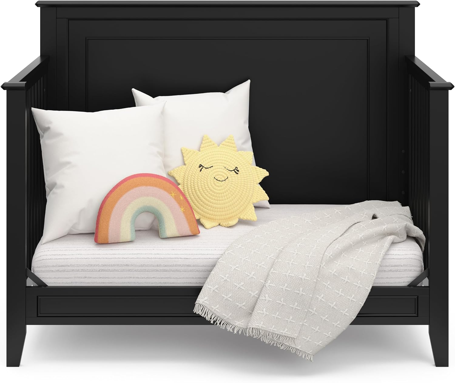 The Storkcraft Solstice 4-in-1 Convertible Crib features clean lines, classic dowels, a detailed back panel, and angled feet that will add a touch of modern style to your baby’s nursery. Designed to adapt to your growing baby, the Solstice is equipped with a 3-position adjustable mattress support base, and can convert into a daybed, toddler bed, and full-size bed. JPMA certified and meticulously tested by independent laboratories to guarantee this product meets the highest standards for your child’s safety. Solstice is backed by Storkcraft's 1-year limited warranty and supportive customer care. Exclusively from Storkcraft, proud recipient of the 2020 Women's Choice Award for 9 out of 10 Customer Recommended Baby & kids furniture.