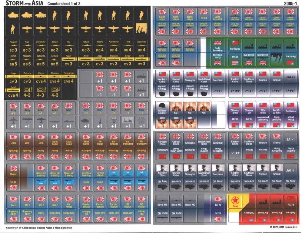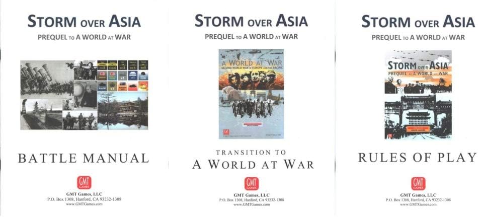 Storm Over Asia Prequel to the main event "A World At War" in the Pacific theater of operations. Item is intended for adults, over the age of 18. This is not a child’s toy. Storm Over Asia is both a companion game to GMT’s A World at War and Gathering Storm, and is a game in its own right, with its own victory conditions. Starting in 1935, Japan, China, Britain, and Russia prepare for war without being sure of just what is coming. Japan must balance its expansion in China, an impending confrontation with the United States and Russia, and the impact of the Pacific theater in a global war. China, Britain, and Russia must try to resist immediate Japanese expansion, while at the same time laying the groundwork for the successful prosecution of war in the Pacific. These short-term and long-term goals will often be in conflict, and misjudgments in either direction may have dire consequences. Storm Over Asia allows players to explore what might have happened if: Japan had prioritized naval expansion, even though it antagonized the United States. Japanese admirals had focused on submarine warfare in the impending war with the Allies. The Japanese had taken the American submarine warfare threat more seriously. Japan had committed to jets, advanced submarines or rockets. Synthetic oil technology had been developed by Japan. Japan had developed a strategic bomber for to use against China … or Russia. Japan had prepared for a direct attack on the Soviet Union, rather than first trying to eliminate the Chinese threat to is flank. Nationalist China had defeated the Communists before Japan invaded. Communist China had expanded its territorial base and armed forces. The United Front had formed early, allowing China to confront Japanese aggression more effectively. Australia and India had been better prepared for war, including by building Australian aircraft carriers or an Indian air force. YOU had been in command.