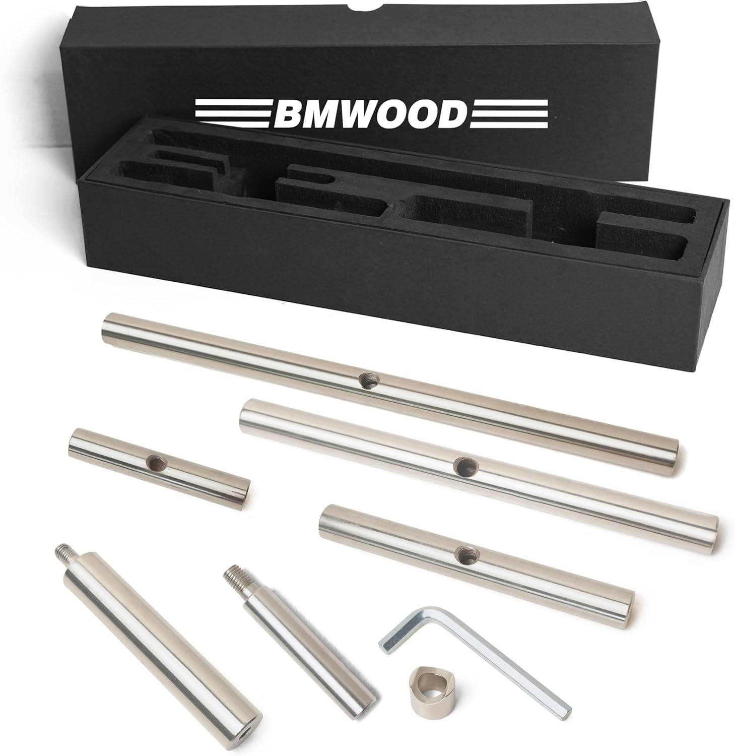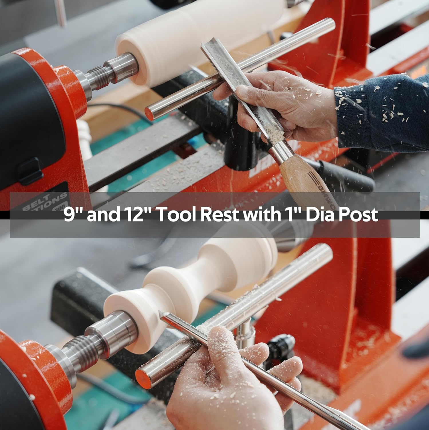 Deluxe Steel Tool Rest Set includes 4 pcs popular tool rests with different length and 2 popular size stems: 1) 4" tool rest 2) 6" tool rest 3) 9" tool rest 4) 12" tool rest 5) 3" length Stem with 5/8" Diameter 6) 5" length Stem with 1" Diameter 7) Locating sleeve 8) Allen key * Strength and solid * Nickel coated * Different lengths for the different jobs * Ease of working closely to the workpiece * Interchangeable stems fit most wood lathes in the market * Locating sleeve ensures the junction tightened