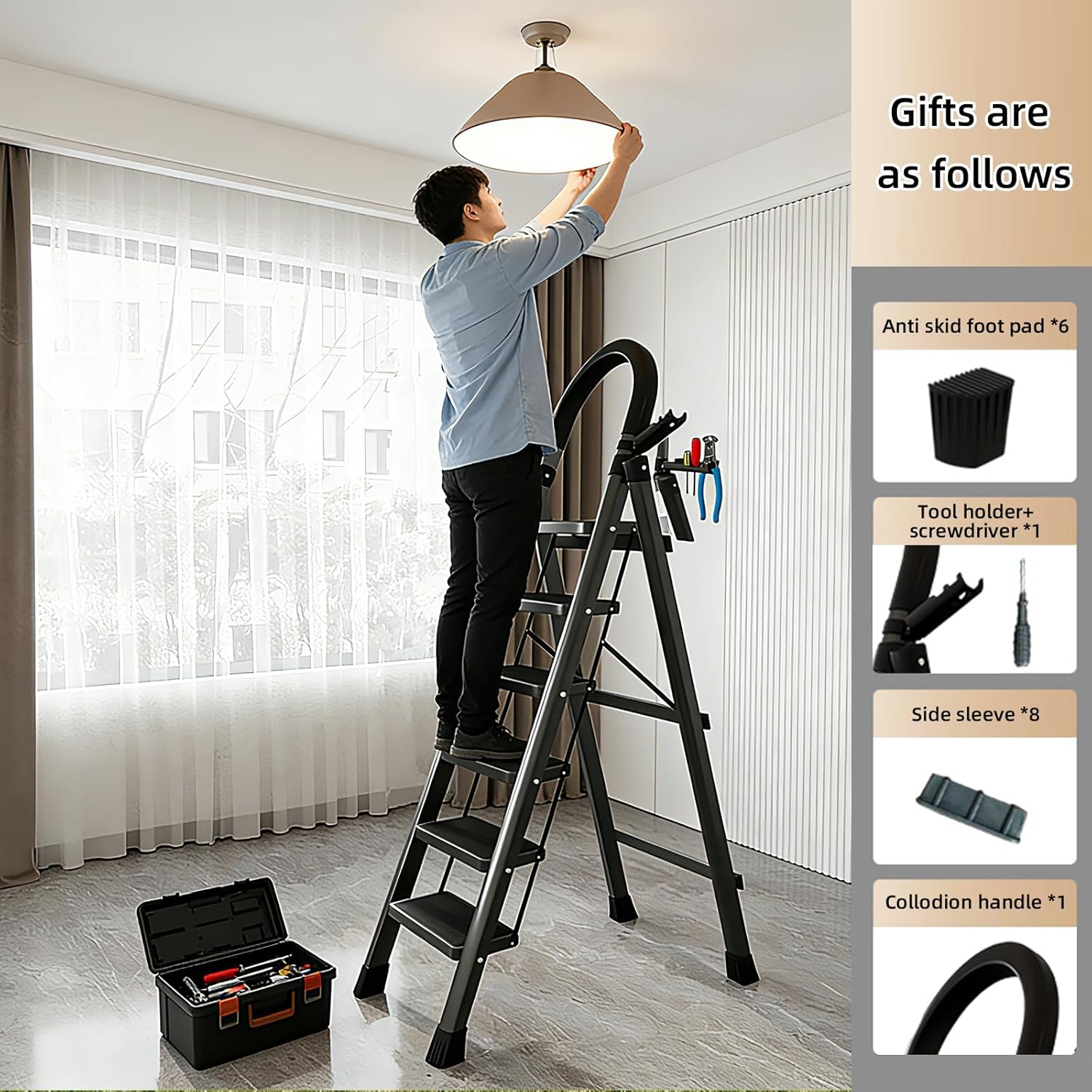Welcome to use the household six step folding ladder, safe and portable, you deserve to have it! Our ladder has been upgraded, with thicker pedals compared to traditional ladders.And add anti slip pads to increase friction and make the pedal more stable; High strength carbon steel base makes the ladder more sturdy and safe.【Product Dimensions】Step ladders measures 66 inches high x 17.7 inches wide x 41 inches deep when open and 69 inches high x 17.7 inches wide x 2 inches deep when folded. With a weight capacity of up to 330 lbs, it meets most of your family's needs。"【Safe and Secure】There are seat belt buckles on the steps to secure the foot pedal and prevent it from sliding. Horseshoe insoles have a large contact area with the ground in rainy weather, making them more slip resistant and safer. We provide comprehensive protection for your safety, allowing you to stand firmly without worrying about slipping or accidents."【Long-lasting and durable material】Our 6 step ladder folding step stool is optimised for thickened carbon steel material, reinforced with high density solid support and tight structure to ensure stability and no wobbling. The footrests of step ladders are upgraded metal footrests with thickened and reinforced tendons on the back to prevent even stress without collapsing." 【Space Saving and Portable】The folding step ladder is so thin, at only 2 inches, that ladder can be effortlessly placed against a wall, in a corner, or under a bed without taking up too much space.The 6-step ladder is made of high-quality steel and is so lightweight that you can easily carry it with just one hand." 【Wide Range of Applications】The 6 step ladder is a must have for cleaning, decorating, painting, DIY projects, the height of the ladder allows you to reach those hard to reach areas effortlessly, perfect for home, office, indoor and outdoor use, with this ladder you can easily complete your projects without worrying about it."