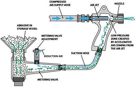 Suction Blast Gun, No. 7, 7/32" Air Jet, Includes 7/16" (#7) Ceramic Nozzle. Suction Sand Blast gun directs a high-speed mixture of air and abrasive to quickly remove corrosion, mill scale, coatings, heat treatment residue, carbon buildup, tool marks, and burrs. The air jet at the back of the nozzle directs a high-speed stream of compressed air through the mixing chamber and out the nozzle. The rapid passage of this air generates negative pressure, causing blast media to flow into the mixing chamber and out the nozzle. This technology is widely known as venturi or suction blasting. The operator holds the Suction gun at a predetermined distance and angle, relative to the surface being blasted. The Suction blast gun can clean, finish, or peen the part being blasted. By moving the gun and the part, the operator quickly covers as much of the surface as needs blasting.