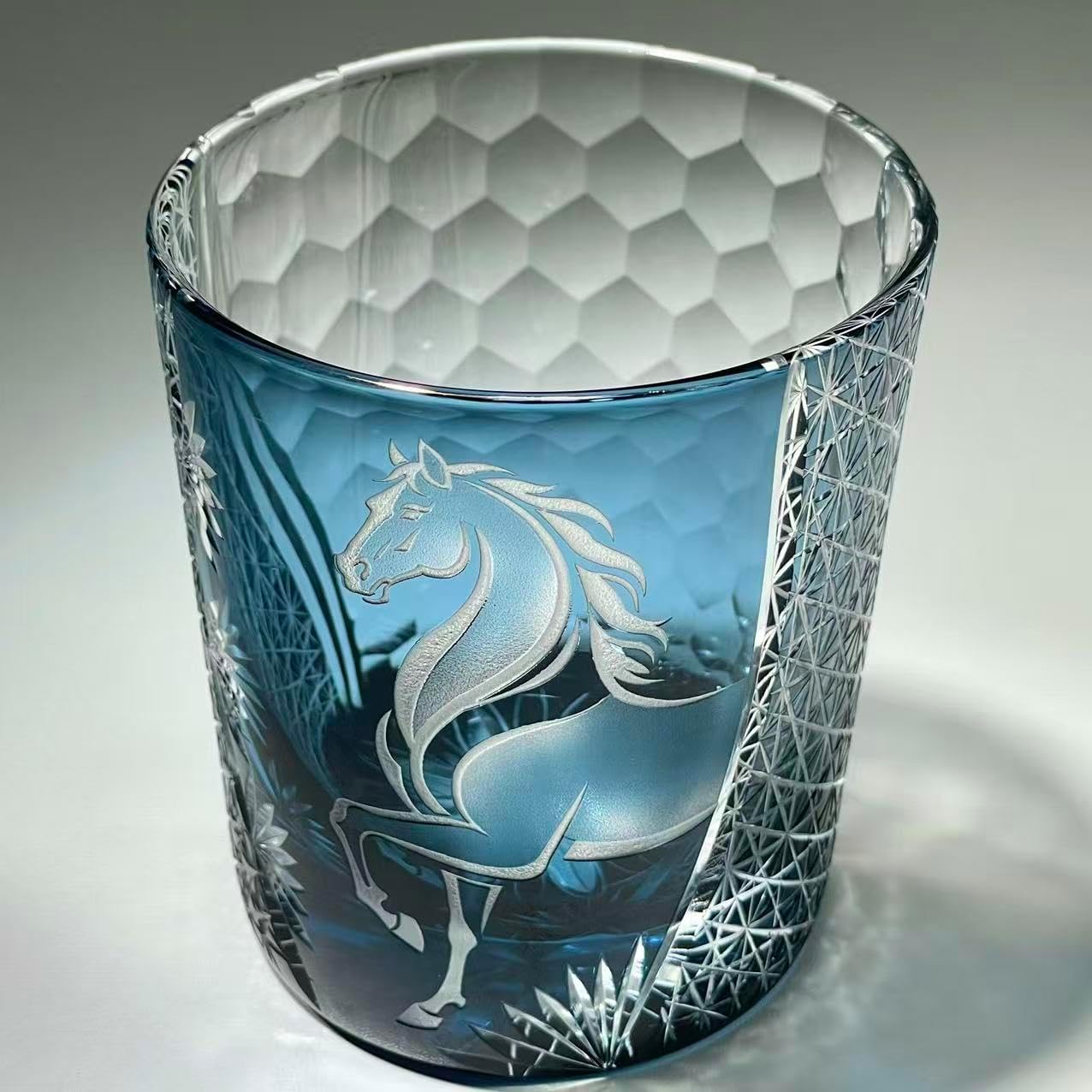 Elevate your drinking experience with this exquisite Edo Kiriko crystal whiskey glass, featuring a masterfully hand-cut soaring eagle design against a mesmerizing blue-tinted background. This luxury cocktail tumbler exemplifies the pinnacle of traditional Japanese craftsmanship, where each intricate detail is meticulously carved by skilled artisans. The stunning geometric patterns and delicate floral motifs that frame the majestic eagle create a sophisticated interplay of light and shadow. When filled, the glass reveals captivating depth and dimension, transforming your favorite spirits into a visual masterpiece. The substantial weight and premium crystal construction provide a satisfying feel in hand, while the carefully proportioned size makes it perfect for whiskey, bourbon, or craft cocktails. Each glass serves as both a functional tumbler and an art piece, making it an impressive addition to any home bar or an outstanding gift for the discerning spirits enthusiast. The timeless design seamlessly blends Japanese artistic tradition with contemporary elegance, ensuring this piece will be treasured for generations.