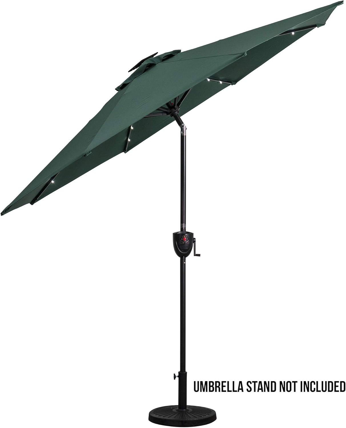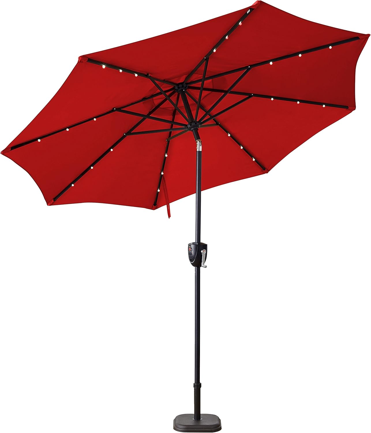 Get ready to entertain from dusk until dawn with the 9' Round 8-Rib Bluetooth Aluminum Solar Lighted Umbrella. This umbrella is a versatile item that moves seamlessly from day to evening use. Bluetooth Capable Speaker easily connects to your mobile device and provides crisp sound quality for all to enjoy. This beautiful accessory will transform any outdoor area into your favorite place to relax with friends, or enjoy a meal at your outdoor table even after the sun goes down. The canopy is 180g polyester with upgraded colorfastness and water-resistant coating, along with a powder-coated aluminum frame, so it is durable and ready to stand up to the elements. This umbrella provides plenty of shade on hot summer days. Simply tilt the umbrella using the tilt function to the perfect angle. This umbrella has a square solar panel at the top, which powers the lights along the umbrella ribs for 9 to 12 hours without the need for electricity. The umbrella pole is standard sized and fits most umbrella stands as well as most dining and bistro sets that are designed to accommodate umbrellas.