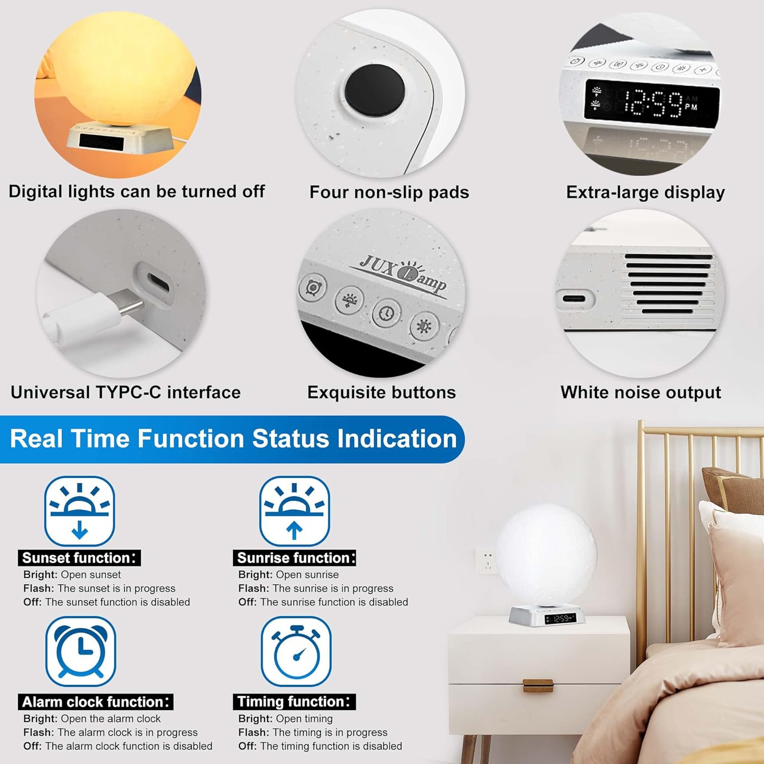 As an invisible “clock” for organisms, Bioclock can make human physiological, biochemical, and behavioral features demonstrate periodical rhythms within 24 hours. Pineal body (known as the third eye of human body) is the control center of bioclock, being essential to maintain the circadian rhythms of human motions and temperature. Pineal cells produce melatonin because of light, sending “time signals” to the central nervous system as per melatonin secreted to fulfill the functions of bioclock. Our “Sunrise Alarm/Bioclock Adjustment Lamp”. They can imitate the natural rising and falling processes of the sun (sunrise/sunset) and preset the automatic light on/off time through programming to effectively regulate human circadian rhythms. 【Technical Parameters】★--DC input: 5V/2A(USB-C interface)★--Color Temperature:Warm color temperature 3000K,Cold color temperature 6000K, Mixed color temperature 4500K.★--LED life circle: over 50000 hours (Brightness decrease less than 30%)【packing list】★--1* Sunrise Alarm/Bioclock Adjustment Lamp unit★--1* USB-A to TYPE-C Cable(Cable length 5 feet)★--1* Product instructions