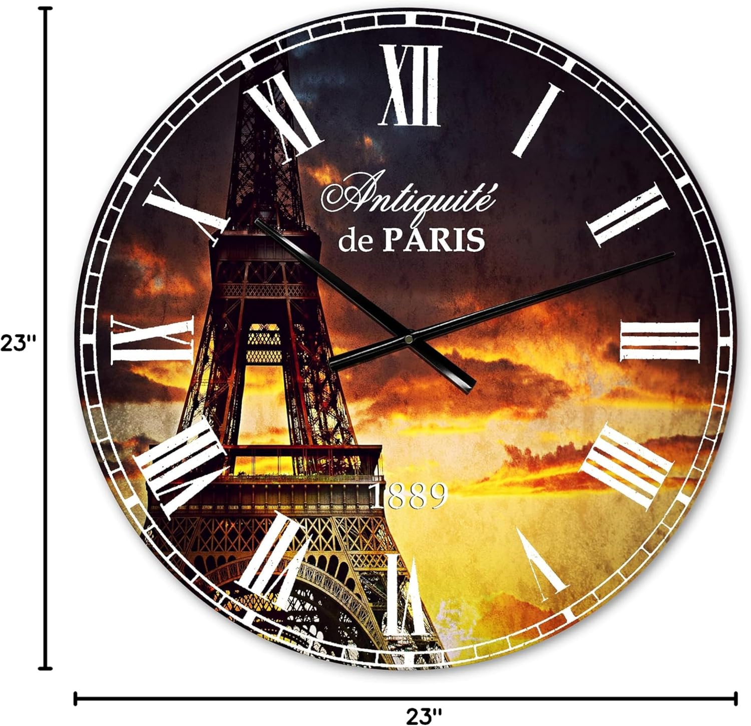 An exquisite design bringing beauty to your home and office, this Brown Industrial circle wall clock is printed on one-hundred percent firm aluminium. The smooth surface is glossy and very reflective, giving this round clock an elegant and contemporary style. For your convenience, this Sunset View with Paris Eiffel tower Clock arrives with an AA battery included and is ready to be installed on your wall right away. This French Country Oversized round clock is available in various sizes, and guarantees to be the center of attention of your space. Features - 1 mm aluminium grade sheet metal - Available in circle 23x23 29x29 36x36 - High Quality Gloss Coating provides deeply vibrant colors - The mounting frame creates a floating artwork illusion - All mounting brackets and hanging instructions are included - Use a microfiber cloth for easy cleaning - AA battery standard included with every order - Effortless to install and hang