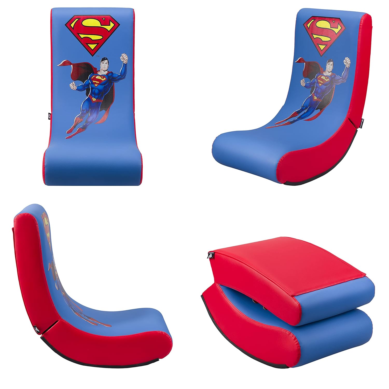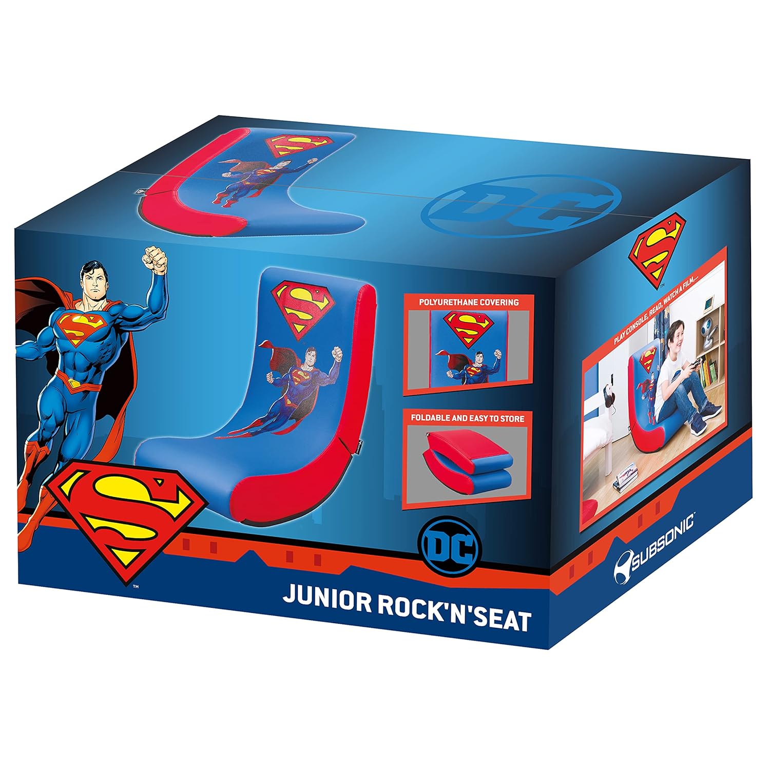 Officially licensed Superman seat. Play comfortably in your bedroom or living room on your Rock'n seat gaming chair. Its high-density foam is specially designed for prolonged sitting without feeling fatigue or pain. Its PU coating is both durable and easy to clean. The rock'n seat gaming chair is compact and foldable, it is very easy to store. Dimensions: Height: 75 cms Width: 41 cms Depth: 75 cms Seat depth: 41 cms Folded height: 38 cms