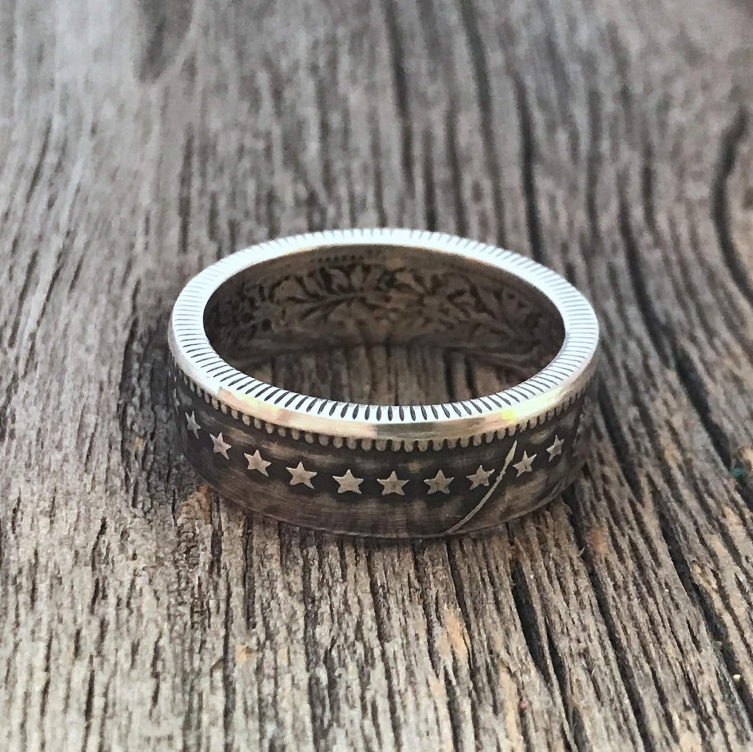 Swiss Silver Coin Ring. Made from Swiss coin 2 Francs or 1 Franc (for small sizes). Silver 0.800 purity. This is the great idea for a gift or just an interesting thing for yourself that will always attract the attention of the surrounding people! The Swiss coins are as beautiful as the Switzerland country! These coins are great for making rings out of them! Amazing coin pattern in combination with a dark patina makes these rings very beautiful and unusual! For rings in sizes 4-5.5 I use 1 Franc coin. For rings in sizes 5-12 I use 2 Francs coin.Finish: dark patina (I recommend!) or fully shiny During ordering you can choose the type of finish (patina or fully shiny). Also I can make this ring in two versions: Stars on the front side (by default) and the stars inside. It's for your choice too. If you have any questions - feel free to write me now! ----------- Don't forget to see my other amazing things!