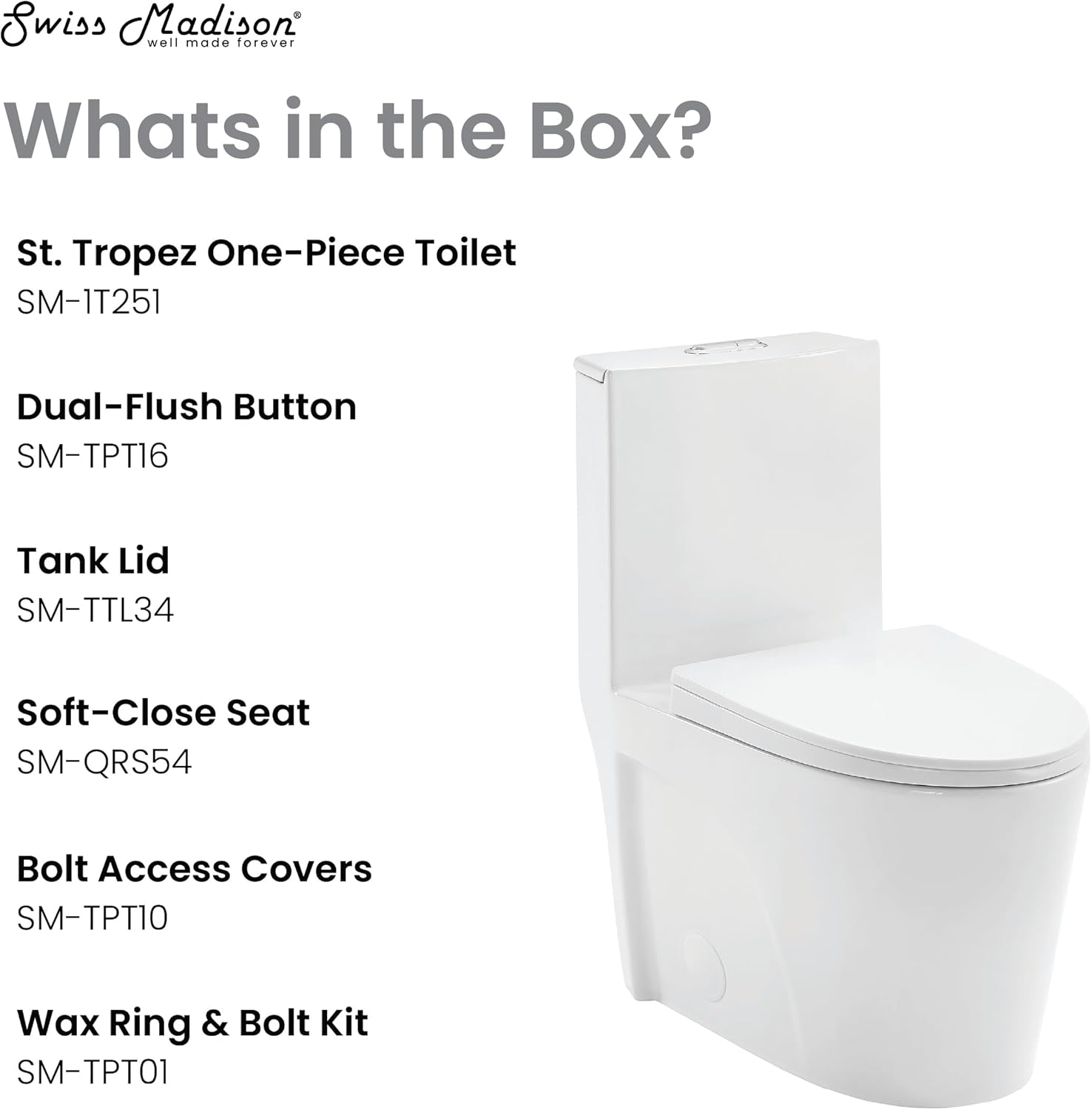 With it's skirted trapway, the st tropezone-piece toilet offers a sleek eye appealing seamless design that is easier to clean. The elongated and comfort height bowl adds more comfort. Dual flush allows you to choose between partial and full (.8/1.28) flush, which allows you to be fiscally and environmentally conscious without sacrificing performance. Quick-release matte chrome hinges allows the seat to be unlatched from the toilet for easy removal and convenient cleaning, no tools required.