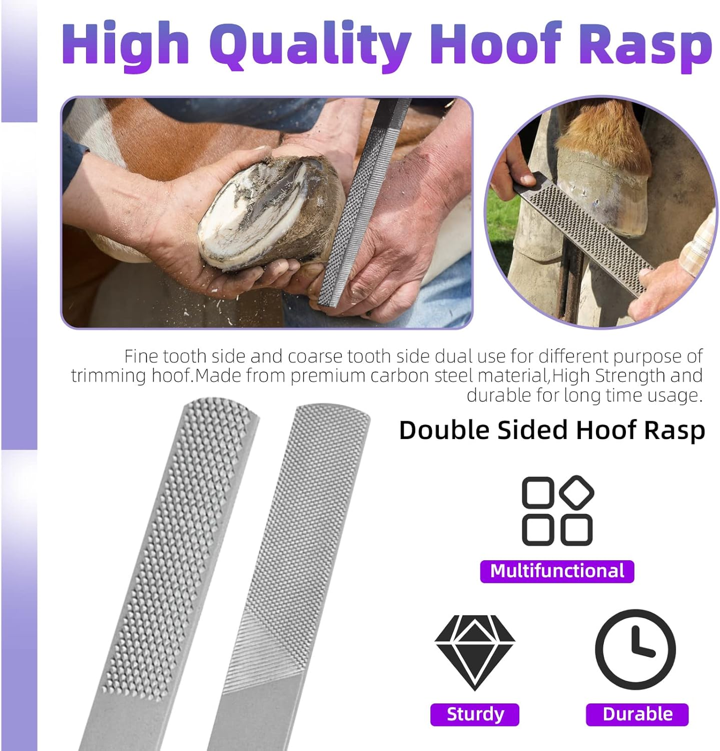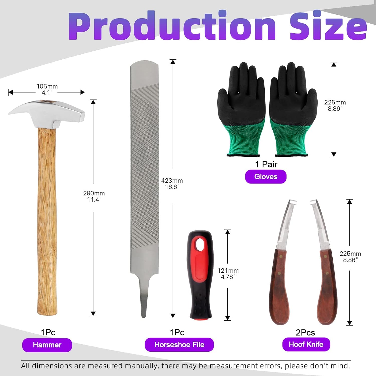 ๐ฏ Swpeet 12Pcs Professional Farrier Tools with Roll Pack, Horses Hoof Trimmers Shears, Farrier Rasp File, Hoof Nipper, Horseshoe Brush, Hoof Knife, Horse Round Mouth Unloading Pliers, Horse Nail Pliers ๐ฏ Why Choose us? ๐ฅ 1, Farrier Tools Professional Kit ๐ซ Comfortable wooden grip which reduces shock and vibration and provide great leverage as well as comfort in the hoof trimming process. ๐ฅ 2, High quality Hoof rasp ๐ซ Horse Hoof Nipper is very suitable for nail cutting, hoof wall removal, easy to cut, making you more labor-saving. ๐ฅ3, Wide Applications ๐ซ Hoof trimming tools are mainly used to trim the hooves of livestock, slowing down the wear and tear of the hooves and protecting them. It facilitates the walking and running of livestock. ๐ฅ 4. A Great Value Kit ๐ซ Equipped with a full range of tools for different functions to meet the comprehensive manicure and cleaning care of horseshoes. ๐ฏ Specifications๏ผ ๐ธ Product Name: 12Pcs Professional Farrier Tools Value Kit ๐ธ Material: Metal ๐ธ Color: As Shown in the picture ๐ธ Sizes: As Shown in the picture ๐ธ Wide Applications: Best Horse Farrier Hoof Tool Kit ๐ธ Taking the intimacy with your beloved horse a step further๏ผprotecting the horse's health is a great way to connect emotionally at the same time. ๐ฏ Package Included: ๐ซ 1Pcs ------------- 16.6 Inch Hoof Rasp with Handle ๐ซ 1Pcs ------------- 6.9 Inch Hoof Trimming Shears ๐ซ 1Pcs ------------- 13.8 Inch Hoof Nipper ๐ซ 1Pcs ------------- Horseshoe Brush ๐ซ 1Pcs ------------- Horse Nail Plier ๐ซ 1Pcs ------------- Nail hoof hammer ๐ซ 1Pcs ------------- Right Hoof Knife ๐ซ 1Pcs ------------- Left Hoof Knife ๐ซ 1Pcs ------------- Packaging Bag ๐ซ 1Pcs ------------- Horse Round Mouth Unloading Pliers ๐ซ 1Pair ------------- Protective Gloves ๐ซ Intotal 12Pcs
