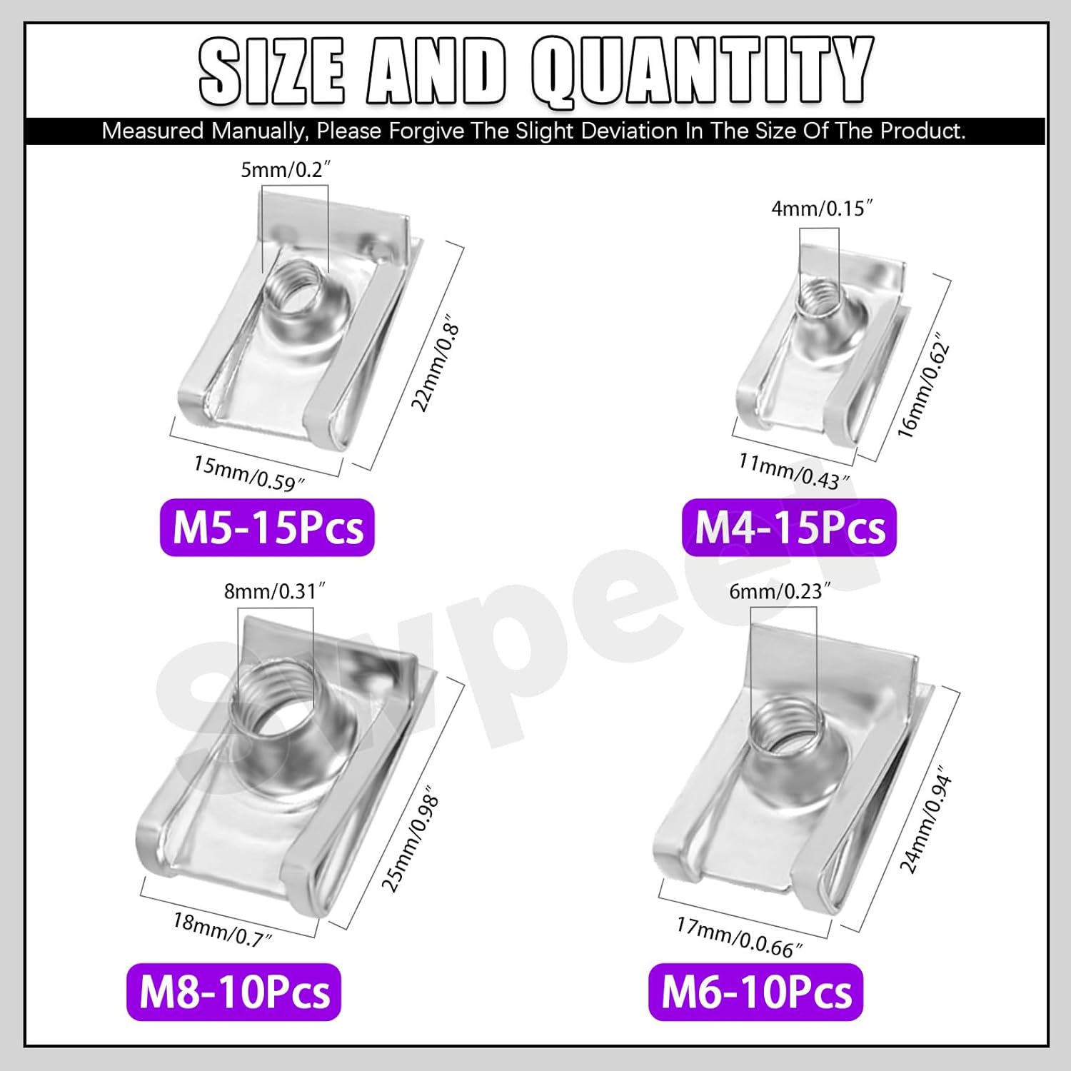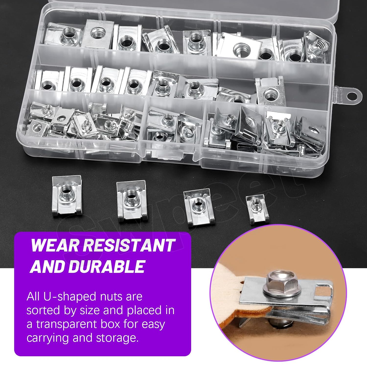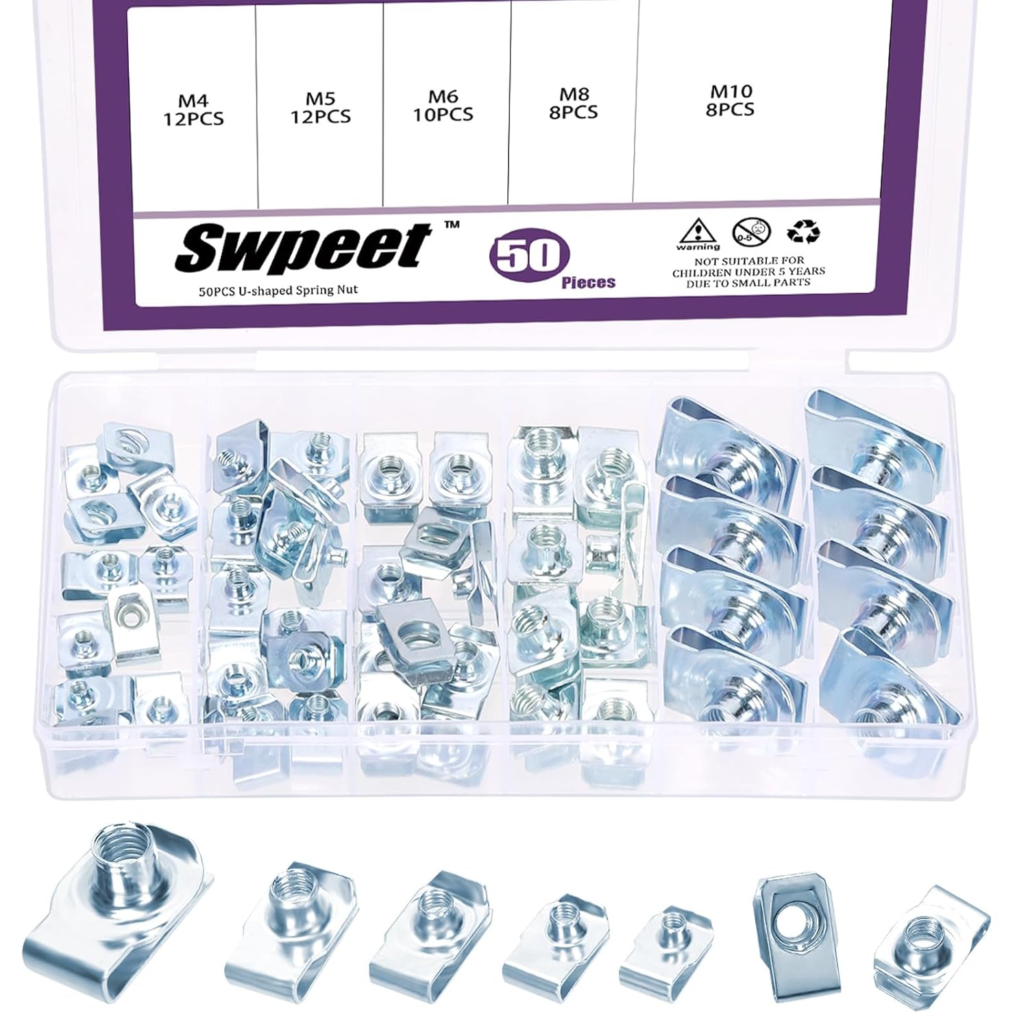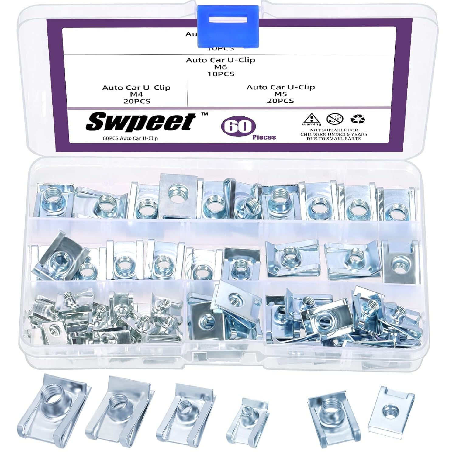 ๐ Swpeet 50Pcs M4 M5 M6 M8 304 Stainless Steel Auto Car U-Clip Assortment Kit, U-Shaped Nut U Nut, Metal Trim Panel Spring Clip Fasteners for Dash Door Panel Interior Compatible with Most Auto ๐ Why Choose Us? ๐ฅ 1.High Quality โจ Made of high-quality stainless steel, with zinc plated on the surface. Resistance to rust and corrosion. ๐ฅ 2.Versatile Function โจ Replace rusted or broken U-clips to secure auto body panel or molding. ๐ฅ 3.Easy to Install โจ Insert the U-clip into one of the sheet metal parts, then pass the screws through the reserved holes of the two parts, and finally fix screws into the U-clip. ๐ฅ 4.Wide Applications โจ Suitable for various auto body panel, dashboards, door trim, radiator, engine cover, bumper, fender and car motorcycle license panel and more. ๐ Specifications โจ Product Name: Auto Car U-Clip โจ Material: Stainless Steel โจ Size: M4 M5 M6 M8 ๐ Package Includes: โจ 15Pcs -------- M4 Auto Car U-Clip โจ 15Pcs -------- M5 Auto Car U-Clip โจ 10Pcs -------- M6 Auto Car U-Clip โจ 10Pcs -------- M8 Auto Car U-Clip โจ 1Pc -------- Plastic Storage Box โจ In Total of 51Pcs
