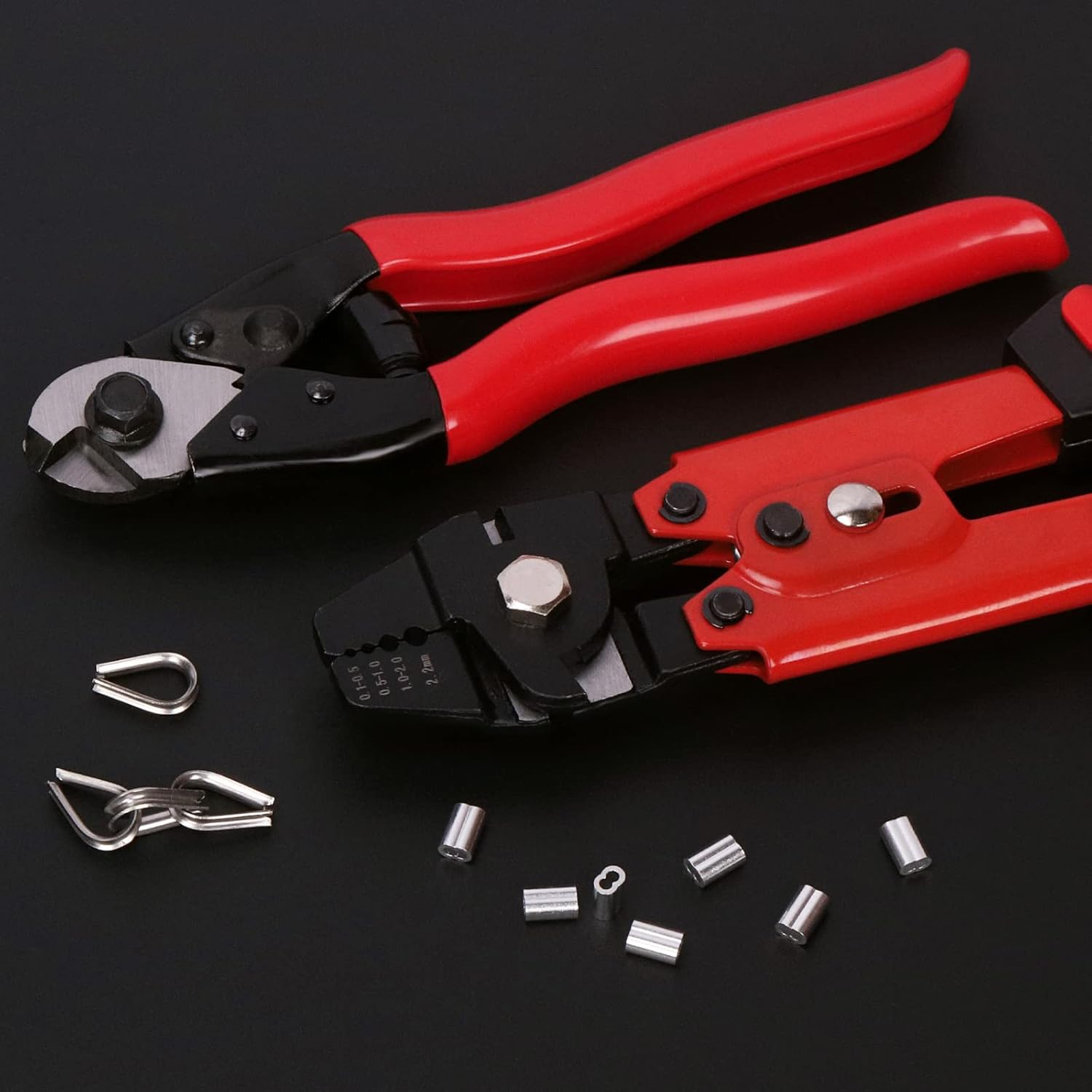 👑 Swpeet 83Pcs Wire Rope Crimping Tool Assortment Set, Cable Crimps and Cable Cutter Up to 5/32", 3 Size Aluminum Double Crimping Loop Sleeve, 2 Size Stainless Steel Thimble and Cut Resistant Gloves 👑 Why Choose Us? 🏅 1.Good Quality ✨ These products are made of high quality materials, exquisite workmanship ensures their quality, you can have a order with confidance. if there is any dissatisfaction please contact us immediately. 🏅 2.Great Value Tool Set ✨ We provide you with a set of professional wire rope crimping tools, including a variety of tools you need to use, tools complete, prince affordable, help save your time and money. 🏅 3.Various Size ✨ There are 3 different size of crimping sleeves--M1.2 M1.5 M2, and 2 szie of steel thimble--M1.5, M2, to meet your different work needs, with sufficient quantity, you can chooes for your real need. 🏅 4.Wide Application ✨ This heavy duty crimper and cable cutter with barrel collar fit crimping tool can be widely used for deck railing, DIY railing, clothesline, outdoor sunshade or hanging rope light etc. 🏅 5.Considerate Packaged ✨ Comes with its own tool bag for easy portability, simple storage and quick access, reducing the risk of losing some tools in transportation. 👑 Specifications: ✨ Material: High-quality Material ✨ Color: Silver Red ✨ Size : As the Picture Shown ✨ Quantity: 83Pcs 👑 Package Includes: ✨ 1Pcs ------------- Wire Rope Crimps(Black Handle) ✨ 1Pcs ------------- Wire Rope Cutter ✨ 1Pair ------------- Cut Resistant Gloves ✨ 10Pcs ------------- M1.5 Stainless Steel Thimble ✨ 10Pcs ------------- M2 Stainless Steel Thimble ✨ 20Pcs ------------- M1.2 Crimping Loop Sleeve ✨ 20Pcs ------------- M1.5 Crimping Loop Sleeve ✨ 20Pcs ------------- M2 Crimping Loop Sleeve ✨ 1Pcs ------------- Storage Bag ✨ In total 84Pcs