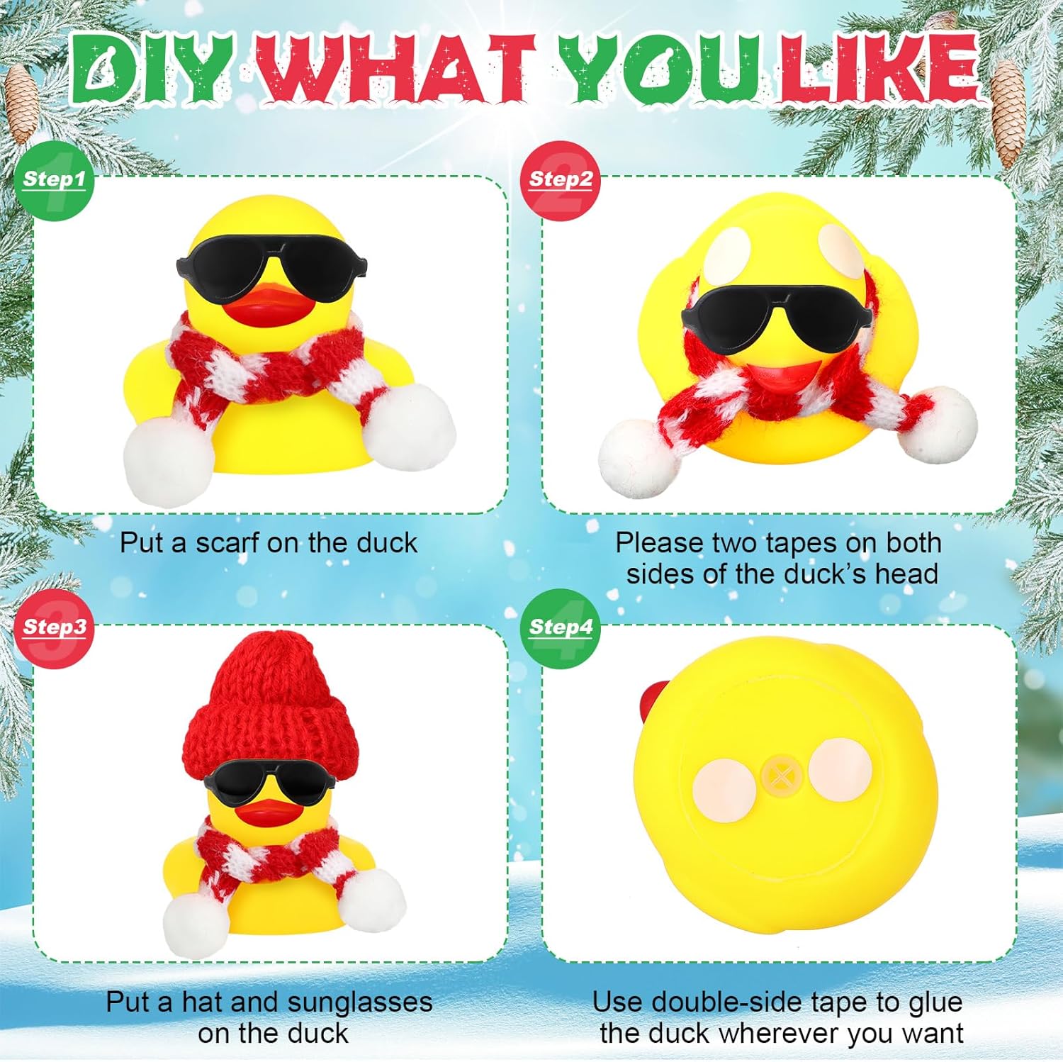 Features: Funny gifts choice: The rubber duck with sunglasses set can be applied as fun gifts for your families, friends, colleagues, neighbors, or someone you love who have children at home, they will be gratitude to you. Leave happy memories: Our mini rubber duckies can be served as photo props, whether it is a wedding, a baby shower, an engagement or a baby's first birthday, so they will leave you with unforgettable memories. Specifications: Material: main rubber Color: as shown Size for mini ducks: 2.17 x 1.77 inches/ 5.5 x 4.5 cm Package includes: 48 Set Christmas mini rubber ducks(with hats, sunglasses, scarves) Notes: Manual measurement, please allow slight errors on size. The color may exist a slight difference due to different screen displays. Age Range:over 3 years old