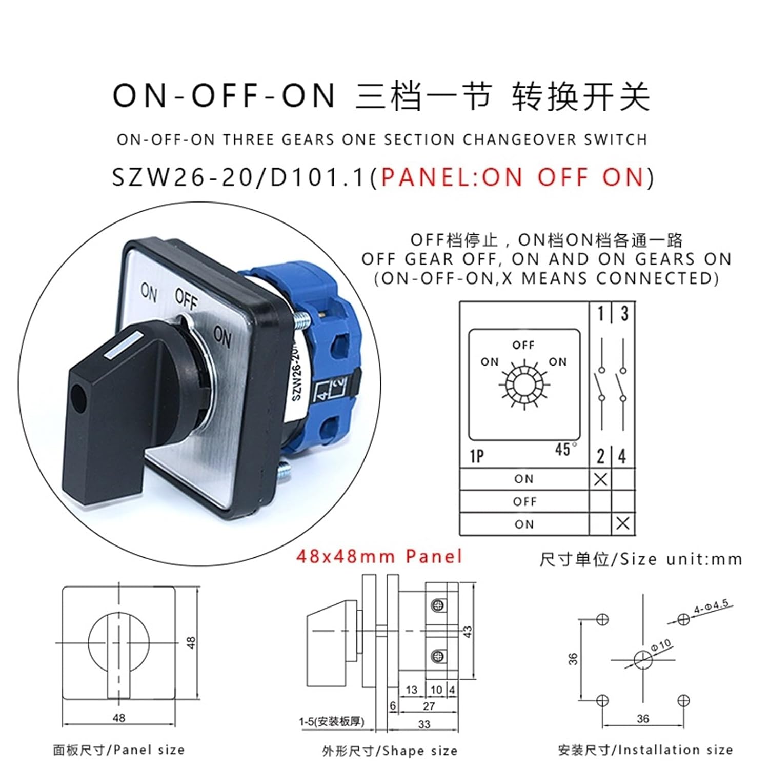 Industrial SwitchesSZW26/LW26-20 ON-OFF-ON Ith 20A Ui 660V 1 Pole D101.1 64X64 48X48 mm Panel mount Changeover Selector Universal Rotary Cam SwitchDescription1.Product Name:SZW26/LW26-20/D101.1 20A 1 Phase Universal Rotary Changeover Cam Switch2.Specification:Lacthing Selector ; Ui: 660V, Ith: 20A ; 1 Phase 4 Terminals3 Position (ON-OFF-ON)3.Rating :AC-15: Ue 440V Ie 20ADC-13: Ue 240V Ie 1A4.Panel size:48 x 48 mm,Install Size:36 x 36mmPanel size:64 x 64 mm,Install Size:48 x 48mm5.which terminal will be connected in different position , please read the wiring diagram as a reference.Position ON: 1-2Position OFF : All terminal disconnectedPosition ON : 3-46.Material:Flame retardant PC material, high temperature resistance; Premium copper parts with silver alloy point.7.Suitablefor the thickness between 1mm to 5mm of the mounting board.8.Ideal choicefor electrical wiring in the power switches, speed switches and asynchronous motor for their start-up and reversing, also can make the conversion of the control circuit.9.Widely usedas circuit control switches, test equipment switches, motor control switches and master control switches, signal transfer switches, or change-over switch for electric welding machinery and other equipment.==========Current : 20AMaterial : PlasticSwitch Type : Universal SwitchWarranty : 6 monthModel Number : SZW26-20/D101.1Features : 1 PhaseItem Type : SWITCHESRated insulation voltage(Ui) : 660VConventional heating current(Ith) : 20AUse category 1 : AC-15Rated working voltage(Ue) 1 : 440VRated working current(Ie) 1 : 20AUse category 2 : DC-13Rated working voltage(Ue) 2 : 240VRated working current(Ie) 2 : 1A