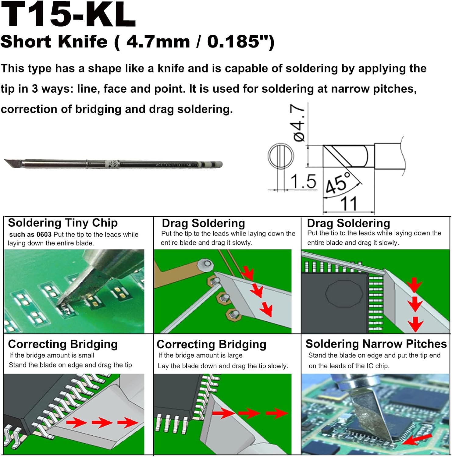 Name: T15-KL T12-KL Short Knife 0.185" / 4.7mm Soldering Tips Replacement Tips Replacement Soldering Tips for FX9501 FM2028 FM2027 FM2021 FX950 FX951 FX952 FM202 FM203 FM204 FM206, These are our Own brand "ACE" but Not "HAKKO" brand. Usage: This shape like a knife and is used for soldering at narrow pitches, correction of bridging and drag soldering. Warranty: We will agree to return tips and full payment refund when if you don't satisfy the tips even After Use