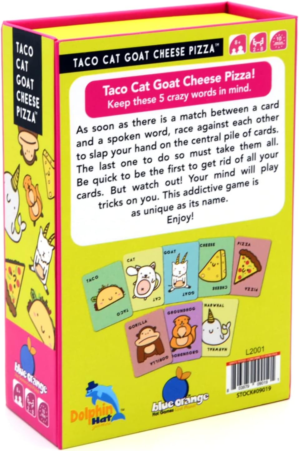 Company: Blue Orange Games As unique as its name, it's filled to the brim with hand-slapping mayhem! Players place a card from their hand face up in a central pile while saying taco/cat/goat/cheese/pizza in player sequence. When the card matches the mantra, be the first to slap your hand on the discard pile. The last to slap gets the "privilege" of picking up all the cards (not a good thing). The winner is the first player to discard their entire hand. Outset does not distribute Blue Orange Games in Quebec. Ages: 8+Game Type: Family Kids Memory Party Pattern Speed Word Available: Available Canada ITEM DETAILS Item No: BL-9019UPC: 803979090191Item Dimensions (in.): 3.125 x 1.5 x 4.75Item Weight (lb): 0.4Origin: China CASE PACK DETAILS Case Pack: 12Case Pack Dimensions (in.): 9.75 x 5.5 x 7Case Pack Weight (lb): 5.55
