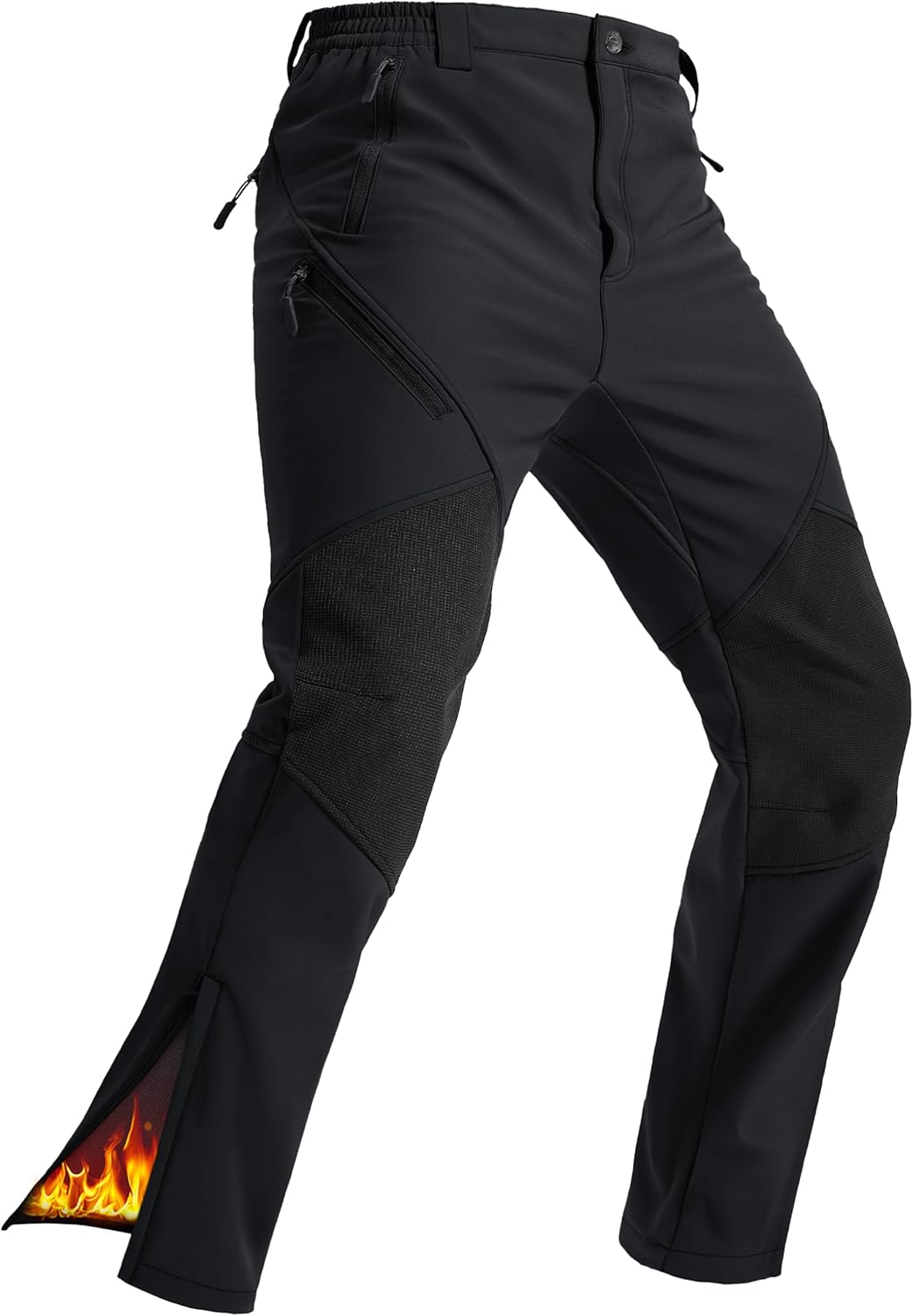 This ski pants feature a warm fleece lined interior for exceptional comfort and insulation against winter winds and cold. The classic soft shell exterior is made of windproof fabric that blocks cold air, further enhancing thermal retention. Both layers work to lock in body heat, ensuring effective warmth even in extreme winter or snowy conditions. This men's snow pants has 8000MM waterproof and 5000 index breathable. It can effectively prevent snow water from seeping through in light rain or snowy conditions, keeping your body dry and comfortable. The breathability can promptly expel the sweat produced by the body and prevent moisture from remaining inside the snow pants. The self-locking zipper of the leg opening makes it easier to put on/take off your fleece lined pants during skiing or hiking, and can promptly expel excess sweat and snow after skiing, prevent moisture from remaining in the legs, and keep you comfortable. The snowboard pants feature 2 front pockets, 1 back pocket, and 1 right side hidden pocket on the thigh, which can store your phone, wallet, keys, gloves or other accessories, providing convenience, efficiency and not easy falling out while on the move. The waterproof softshell snow ski pants are especially suited for skiing, snowboarding, hunting, camping, hiking, ice fishing, mountaineering, adventure, tactical training, travel, climbing, and other winter sports.