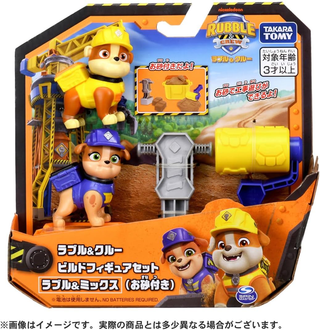 Fun sand game! Enjoy sand building! A playset of figures and sand from the mix of Rubble and Crew is here! (1) Use sand and small items to have fun in construction. (2) You can store the sand in the case after playing. Set contents: figure (2), sand (about 80g) (1), roller (1), push (1), case (1), case (1), case (1),