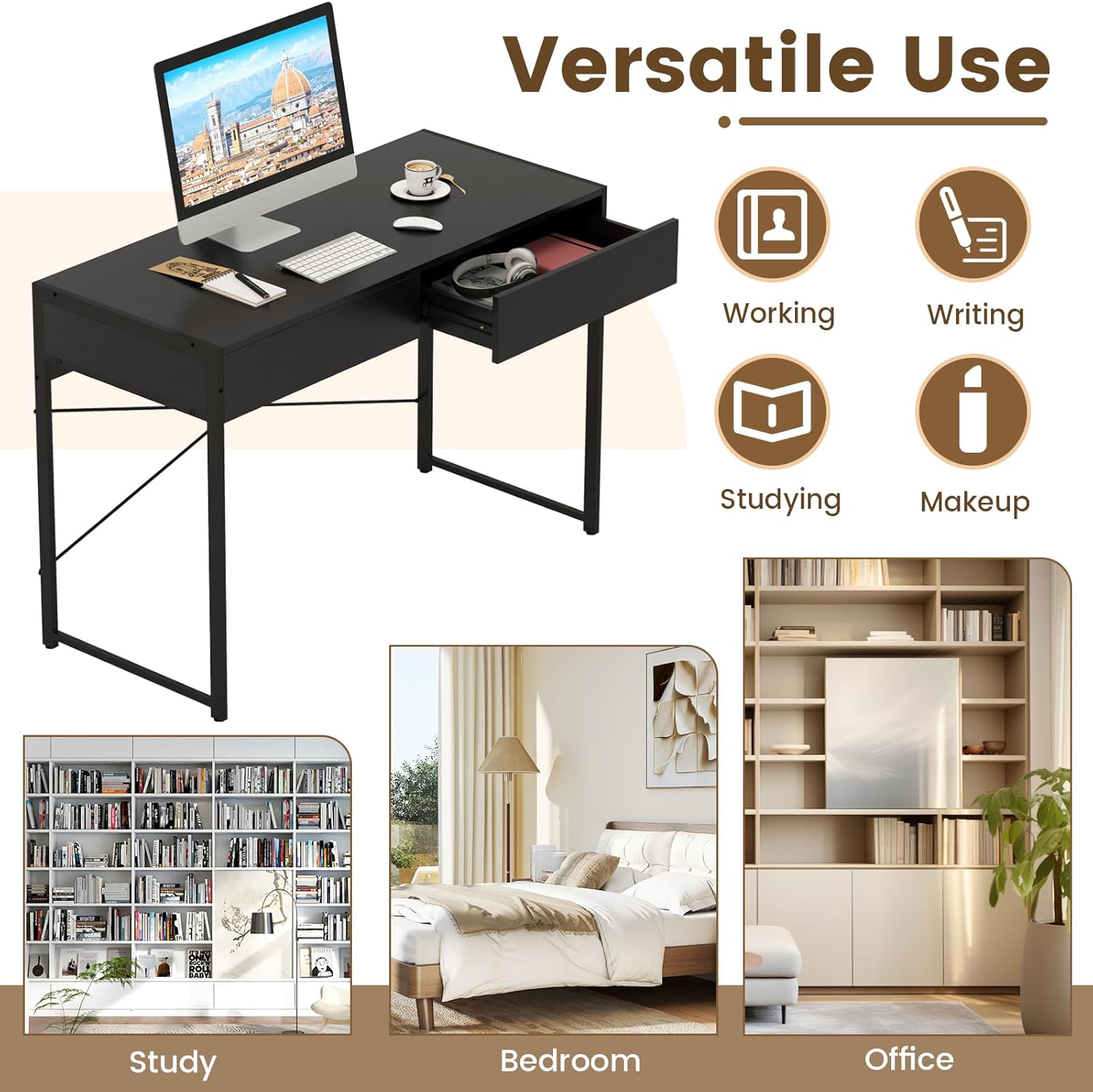 Description:A reliable workspace for home or office!Equipped with 2 spacious drawers, this 44 inch study desk provides ample storage to keep your workspace tidy and organized. This computer desk is designed to support your productive days with its robust load-bearing capacity, thanks to a stable metal frame and adjustable foot pads that enhance its strength and stability. Now with X-shaped bracket and anti-toppling device, the laptop desk is more stable and secure compared to before without X-shaped bracket and anti-toppling device. The sleek and concise design, along with its practical features, makes this desk a seamless addition to any room.Features:Spacious tabletop can free you from messy working environment2 pull-out drawers provide classified storage space for office suppliesHeavy-duty metal frame to improve stability and great support Reinforced X-shaped bracket is not easy to deform and built to lastEquipped with anti-toppling device for higher safety and stabilityAdjustable foot pads ensure a secure foundation on various surfacesSuitable for working, writing, studying and makeupApplicable to study, bedroom and officeSmooth metal drawer slides make pull out easierConsiderate details include easy-to-clean surface for minimal upkeepAssembly neededSpecifications:Color: Black/Rustic Brown & Black/GreyMaterial: Engineered Wood, MetalOverall Dimensions: 44" x 19" x 30" (L x W x H)Inner Size of Drawer: 19" x 11" x 2.5" (L x W x H)Height from Drawer to Ground: 24"Net Weight: 39.5 lbsWeight Capacity of Tabletop: 200 lbsWeight Capacity of Each Drawer: 25 lbsPackage Includes:1 x Computer Desk1 x User Guide
