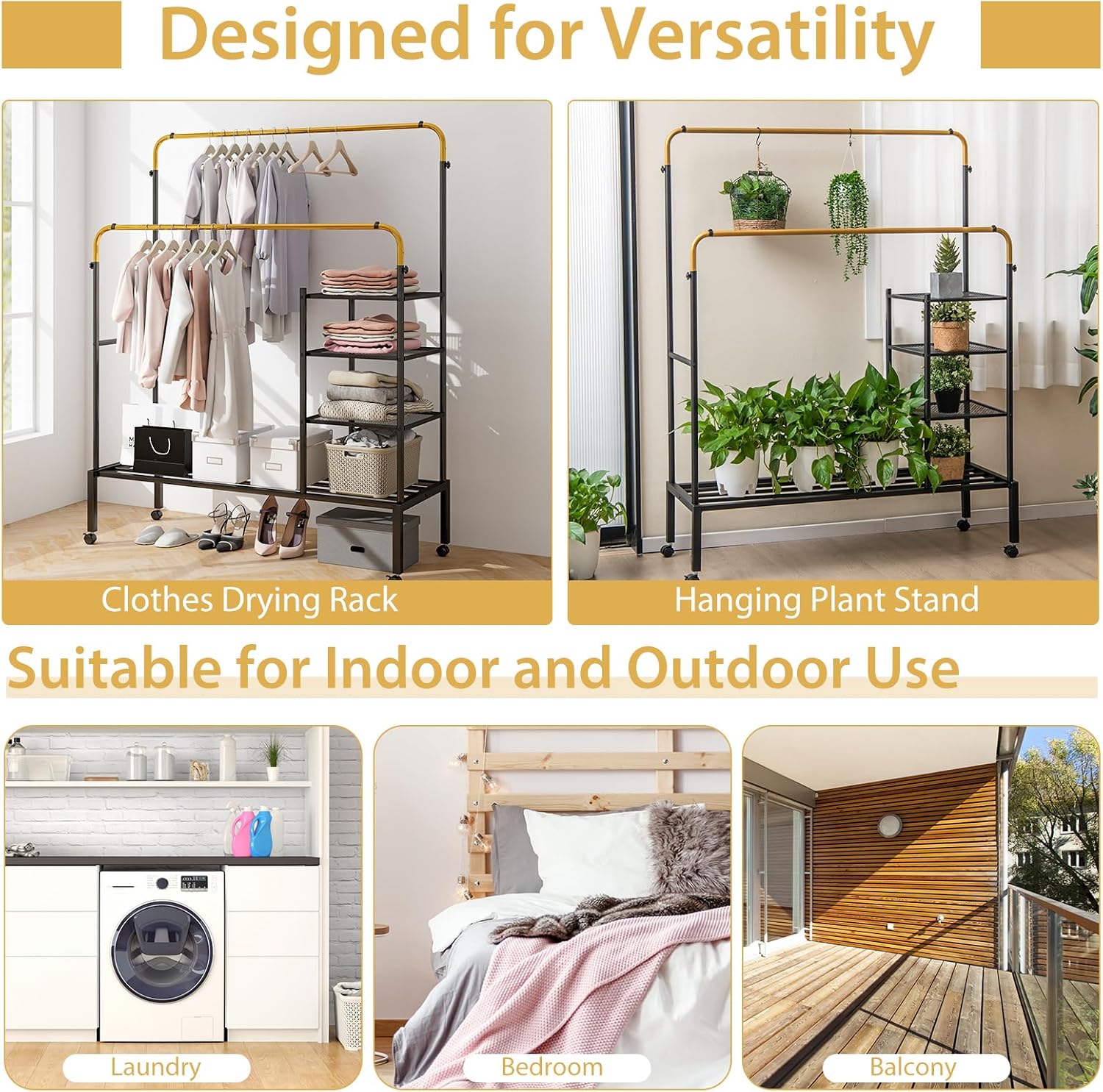 DescriptionSay bye to cramped laundry areas with our double rods garment rack!The clothes drying rack has 2 height adjustable hanging bars with individual adjustment, allowing it to hold clothes of various lengths. Moreover, the side and bottom shelves provide more storage options. Made of solid carbon steel, this garment rack is durable and sturdy. Equipped with 360° swivel wheels, the clothing rack can be easily moved around. More importantly, the hanging bars feature anti-falling devices to prevent hangers from slipping off. In addition to a garment rack, it also serves as a hanging plant stand, making it an ideal complement for the laundry, bedroom, balcony and any indoor or outdoor space.Feature2-position hanging rods with tool-free adjustment for easy useDiverse drying and storage space for different types of clothingSmooth and lockable wheels for hassle-free relocationHigh-strength carbon steel for durability and sturdinessAnti-falling devices for better clothes protectionAlso serve as a hanging plant stand for versatilityWidely applied in the laundry, bedroom, living room, etcSpecificationColor: Black + Gold/Black + SilverMaterials: Carbon Steel, PP, NylonProduct Dimension: 53" x 21" x 64.5"/67" (L x W x H)Adjustable Height of Lower Bar: 49"/51.5"Size of Mesh Shelf: 15.5" x 14.5" (L x W)Distance between Each Shelf: 8"/9"/10"Ground Clearance: 10.5"Net Weight: 25 lbsMax Weight Capacity: 150 lbsPackage Includes:1 x Clothes Drying Rack1 x Instruction