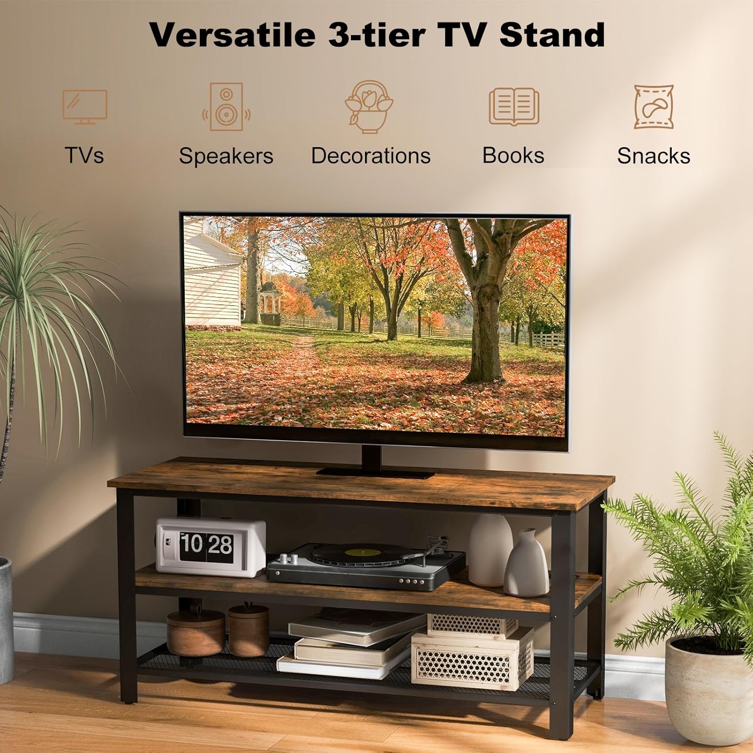DescriptionKeep your entertainment essentials in an organized way with the TV console table. The TV stand for up to 50” TV comes with 2 open shelves. Therefore, not only can you showcase your TV in style, but you can also organize your media gear effortlessly. With included charging station, your media devices will stay charged and organized with our industrial TV cabinet. Additionally, the robust metal frame of the entertainment center provides unmatched stability and support for your TV. Moreover, the adjustable foot pads ensure that your TV is securely in place. Whether you are looking to anchor your living room entertainment, organize your bedroom media setup, or add a distinctive touch to your entryway, the versatile TV stand is the perfect choice.FeatureSuitable for TVs up to 50 inchesEquipped with a ETL certified charging station to power up your devices Large top and 2 storage shelves hold your TVs, speakers and decorations in placeRobust L-shaped metal legs ensure a stable structureAdjustable foot pads keep balance and protect the floorElevated legs provide space for cleaningVersatile as a TV stand or entryway consoleBottom shelf with mesh grid promotes airflowEasy-to-clean surface with wood grain adds styleFeaturing industrial style to seamlessly fit your living room, bedroom, entrywaySpecificationColor: Rustic BrownMaterial: Engineered Wood, MetalOverall Dimensions: 43.5” x 16.5” x 21” (L x W x H) Distance Between Shelves: 7.5”, 7” Height off the Ground: 2.5” Load Capacity of Tabletop: 135 lbsLoad Capacity of Middle Shelf: 135 lbsLoad Capacity of Bottom Shelf: 70 lbsLength of Power Cord: 4.7 ftNet Weight: 37 lbsPackage Includes: 1 x TV Stand1 x User Guide