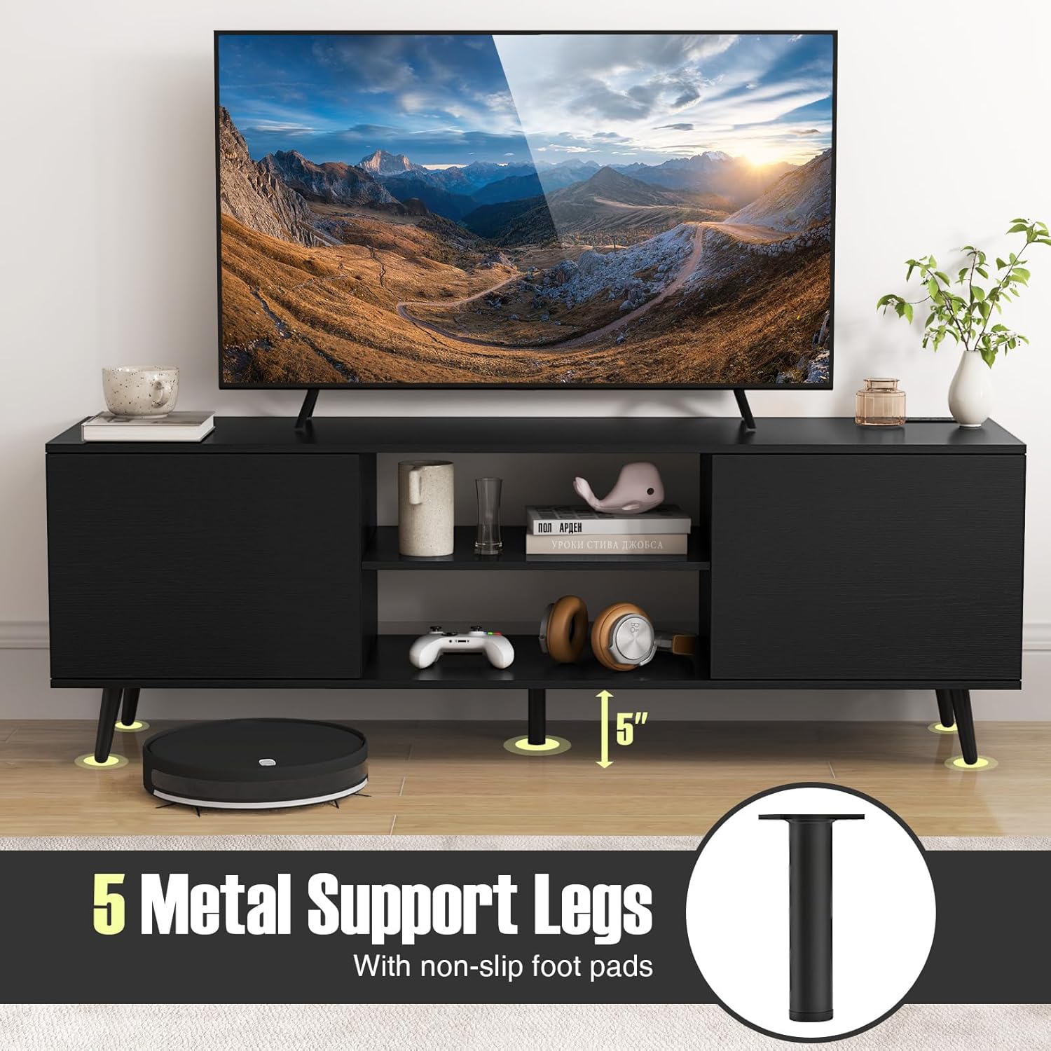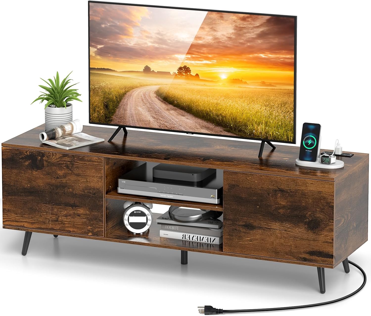 Description:Transform your living room with our mid-century modern TV stand! With a sleek tabletop that supports up to 60" TVs, the TV stand perfectly blends elegance and functionality. Say hello to a clutter-free environment with our integrated power outlets and USB ports that make charging devices a breeze - no more ugly extension cords! Maximize your storage with a 3-position adjustable shelf and roomy cabinets, ensuring everything has its place. Built to last, our unit features robust metal legs with non-slip pads to protect your floors. Plus, the smart cable management system and easy-to-clean design make maintaining your stylish space simple. Features:53.5" wide tabletop fits TVs up to 60"Features 2 open shelves and 2 cabinets for storing media supplies3-position adjustable shelf with 1.3" clearance for customized storageWith 2 AC outlets, USB-A and USB-C ports for convenient charging5 metal legs offer extra support to prevent warping or crackingNon-slip foot pads to protect your floor from scratches5" clearance benefits floor cleaningSoft-close metal hinges to prevent pinchesCable management hole for a tidy organizationEasy-to-clean surface saves time on maintenanceSpecifications:Color: Rustic Brown/BlackMaterial: Engineered Wood, MDF, MetalOverall Dimensions: 53.5" x 16" x 18.5"(L x W x H)Dimensions of Open Shelf: 19" x 16"(W x D)Overall Height of Middle Compartment: 12.5"Adjustable Shelf Clearance: 1.3"Inside Dimensions of Cabinet: 16" x 15" x 12.5"(L x W x H)Raised Height from Ground: 5"Compatible TV Size: 43"/50"/55"/60"Power Cord Length: 4.9 ftAC Outlet: 125V/12AUSB A & USB C: 5V/2.4AWeight Capacity of Tabletop: 155 lbsWeight Capacity of Shelf: 35 lbsWeight Capacity of Cabinet: 45 lbsNet Weight: 43 lbsPackage Includes:1 x TV Stand1 x User Manual