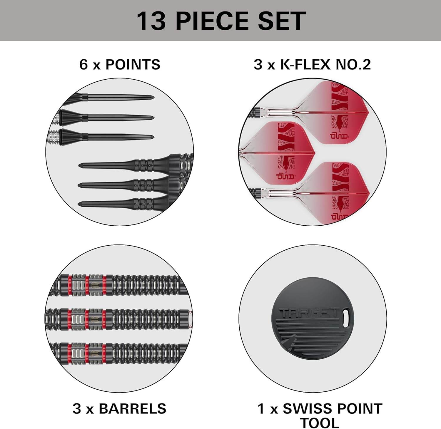| Included Components | 3x 95% Tungsten Barrels 3x Black Pixel Tips 3x Black Titanium Conversion Points (30mm) 3x K-Flex No.2 Flights & Shafts (Short, 19mm) 1x Premium Swiss Point Tool 1x 1 Month DartCounter App Subscription |