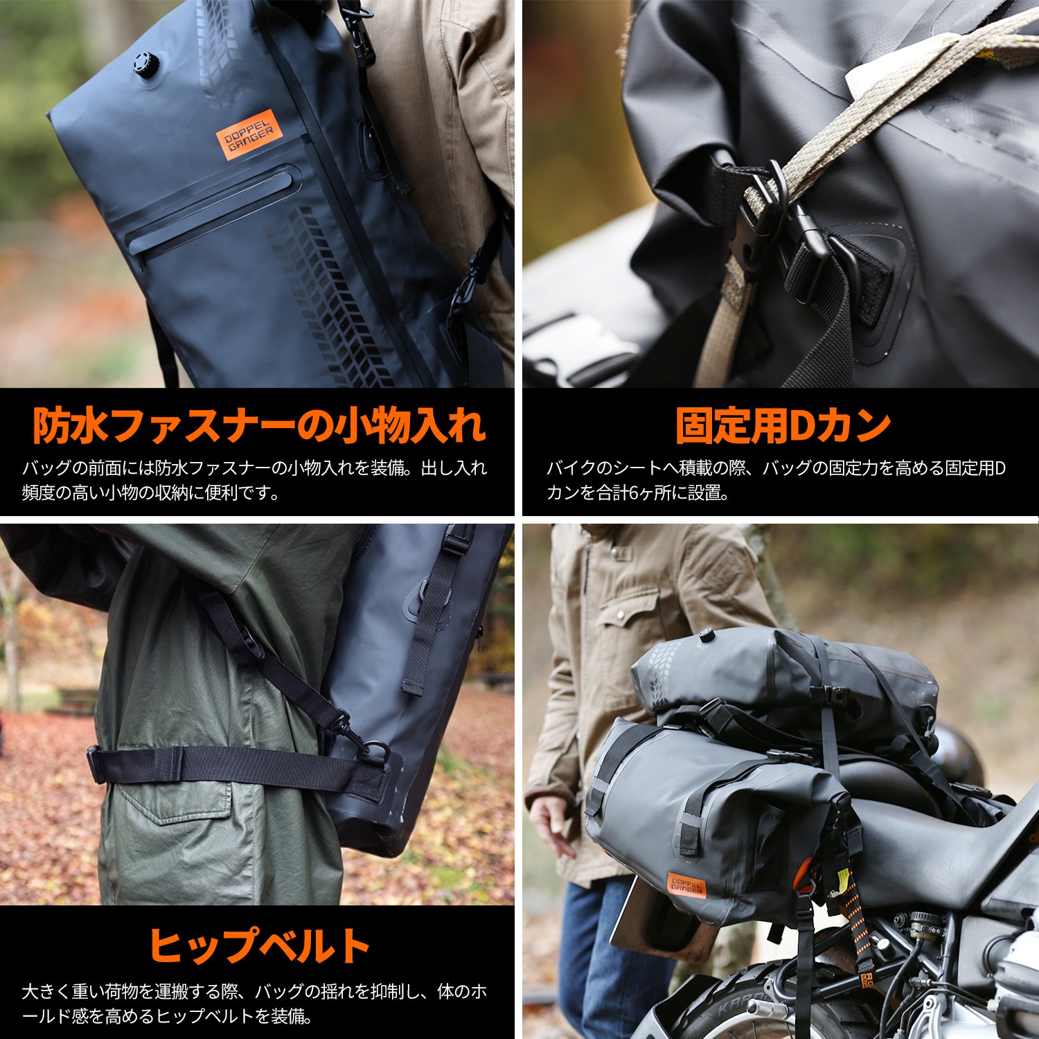 Even if I get wet, my items will not get wet. Waterproof bag that can change into a backpack or seat bag. Waterproof backpack with a roll-top closure made of airtight tarpaulin material. When securing the seat for motorcycle touring, remove the unnecessary shoulder strap and use it as a seat bag. For outdoor use, wear the shoulder strap to make it a backpack. Easy to choose your favorite bag style. A number of D-rings are included to secure it anywhere in the bag, and it also takes into consideration when using it as a seat bag. A waterproof bag that can be used in a variety of situations. The backpack is made of tarpaulin material that is heat crimped to provide high water resistance and protects contents from water immersion in the rain. Ideal for storing items such as clothing, bedding, food and electronics that you don't want to get wet. The image is BK. As a waterproof backpack It can be used as a waterproof backpack for outdoor situations where the weather changes easily. The hip belt makes it easy to carry heavy loads. As a seat bag Removable shoulder strap that adds bulk to your motorcycle A D-ring for fixing is included in every location, making it easy to load and secure your luggage. Touring cord not included. Dry bag It can also be used as a dry bag to prevent your wallet, mobile or towel from getting wet while kayaking, canoeing, fishing or swimming.