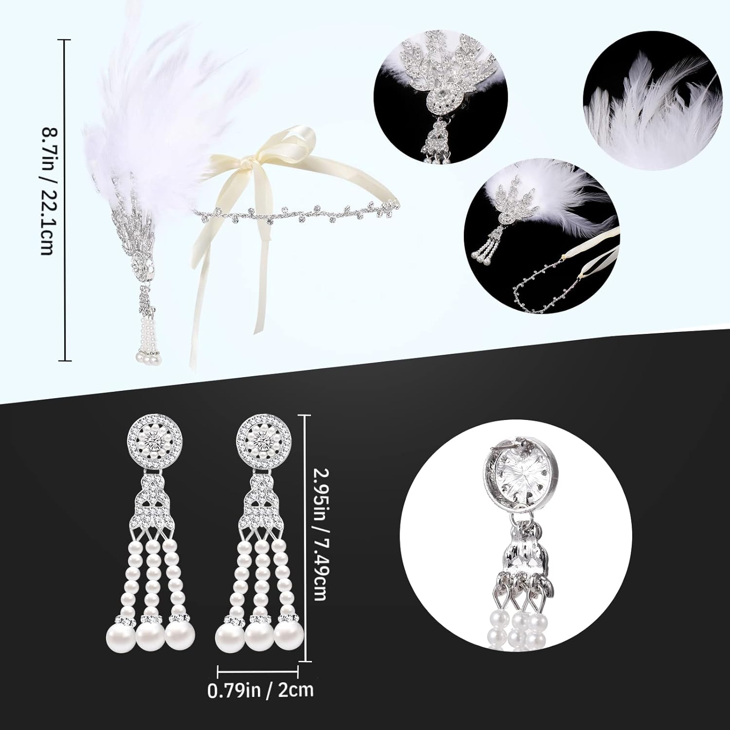 | Included Components | Feather headpiece, Dangle earrings, Stretch satin gloves, Pearl necklace, Holder prop, fan |