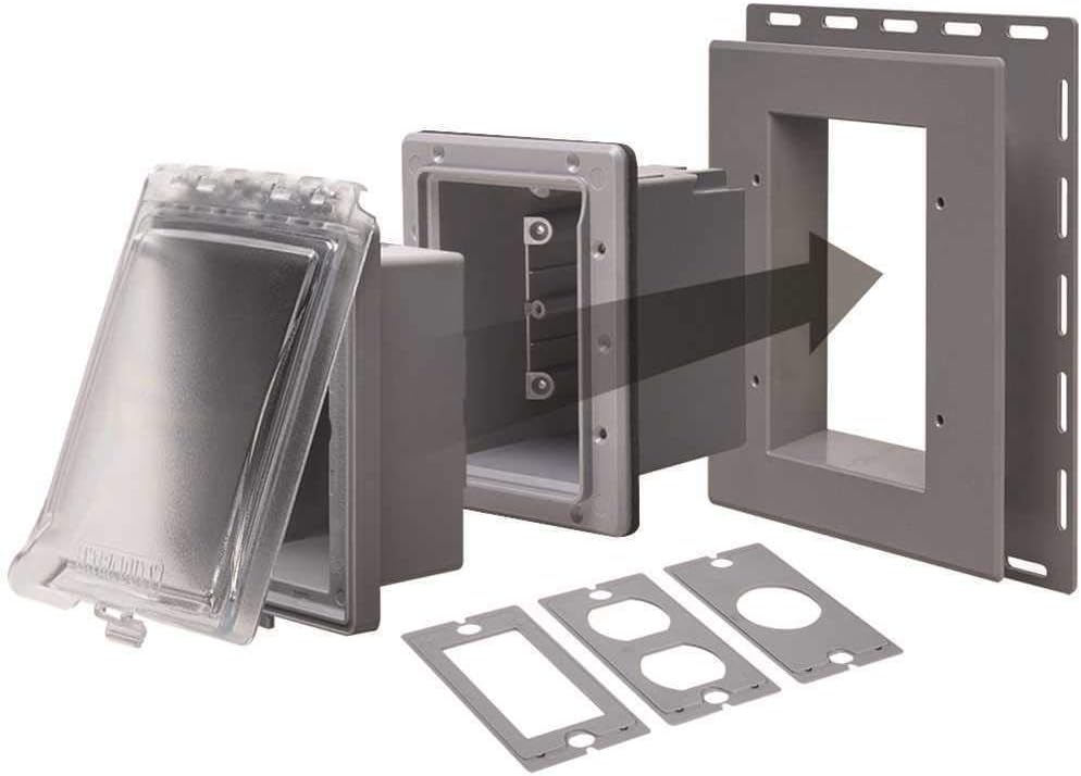 Outdoor recessed wall outlet enclosure. For new work and old work, compatible with common siding types and materials such as vinyl, wood, stucco, brick, and block. Weatherproof, mounts horizontally or vertically, and mounts on stud or in the wall. Compatible with duplex, GFCI (ground fault circuit interrupter), or round receptacle - receptacle not included. Paintable, 2-3/4 In. inward depth of large plug & cords, includes optional siding flange, 21.0 cubic inch wiring capacity, (2) 0.5 In./0.75 In. eccentric knockouts. Dimensions: 4.56 In. W. x 6.15 In. H. x 4.98 In. D.