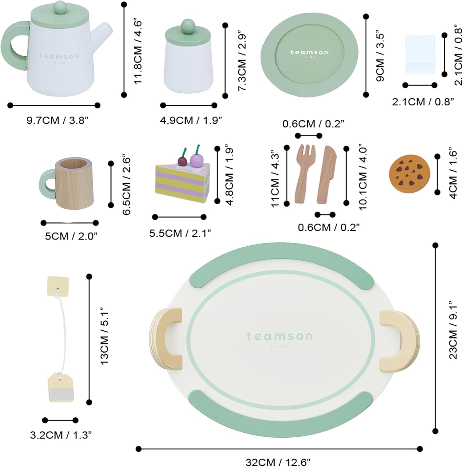 | Item Type Name | Teamson Kids Little Chef Frankfurt 20 Piece Wooden Tea Party Set with Tea Pot, Cups, Serving Accessories and Pretend Dessert Food, Green/White |
