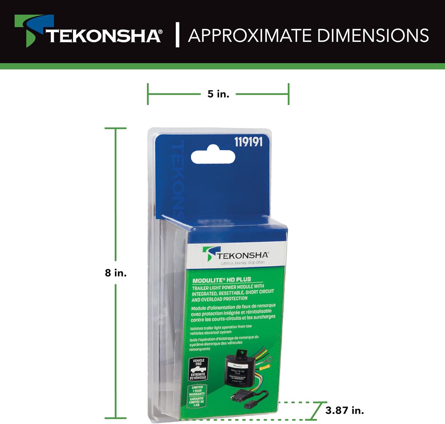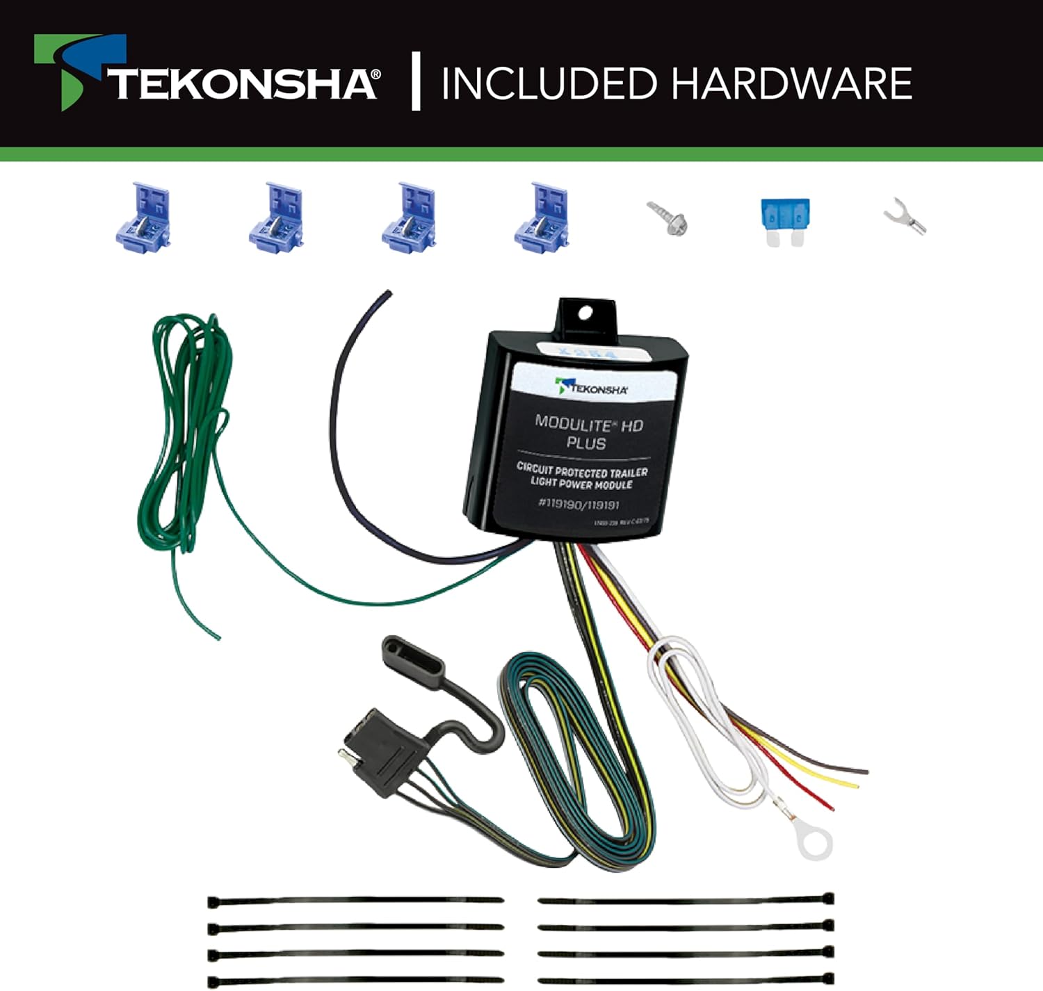 Tekonsha 4 Flat Connector ModuLite HD Plus Protector Trailer Wiring Harness powers your trailer's stop, turn, tail, and running lights without overloading your vehicle electrical systems. This trailer hitch wiring harness has integrated re-settable Short Circuit and Overload protection to safeguard itself and the tow vehicle from shorts and installation wiring mishaps. Advanced circuitry works in all standard applications as well as vehicles with ST and STT pulse width modulation (PWM) systems and can be used on a 2 wire or 3 wire system. This wiring harness for trailers is rated for up to 4.2 amps stop light/turn signal circuit capacity and 7.5 amps taillight circuit capacity. The tow hitch wiring harness kit includes wire, pigtail with 4-flat connector and cover, fuse, splices, comprehensive installation instructions, and more. Tekonsha offers the largest, most complete line of replacement vehicle wiring harnesses. So, what are you waiting for? Hit the road with the peace of mind only Tekonsha can provide. Life's a Journey. Stop Often.