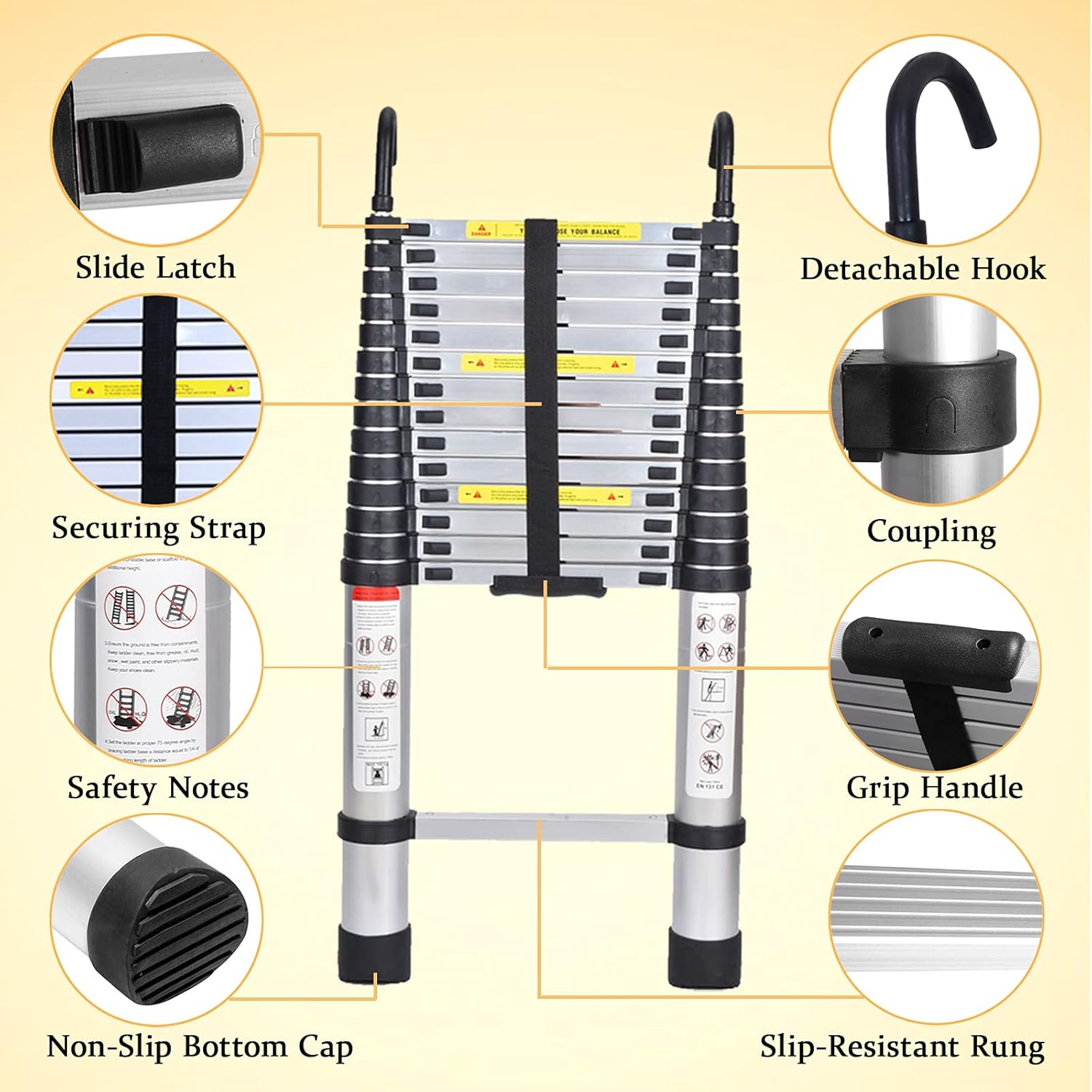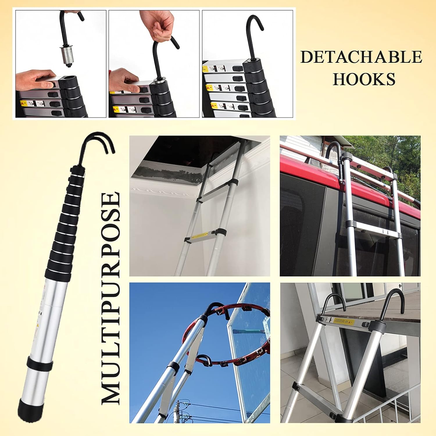 Our Telescopic ladder conforms to EN131 standards and is CE registered, which is extremely popular for home use or trade use. The ability to store a ladder in the most confined of spaces and to quickly and easily open it up to the exact height needed, has made this aluminum telescopic ladder an invaluable tool! 🟠Specifications: - Extended Height: 4.4m / 14.5ft - Folded Height: 89cm / 2.9ft - Width: 48cm / 1.57ft - Hook Height: 10cm / 4inch - Number of Ladder Step: 15 - Step Interval: 30cm / 11.8inch - Pedal Width: 4cm / 1.6inch - Net Weight: 12kg / 26lb - Max Load: 150kg / 330lb - Material: Premium Aluminum Alloy & ABS Plastic *Equips with 2 hooks, they can be hung on a pipe with a diameter of less than 7cm. 🟠Features: 1. With 2 detachable hooks--Increase security 2. Manufactured to the highest standard, this ladder conforms to EN131 standards and is CE registered. 3. Extendable design, Lightweight yet durable and compact for easy storage and transportation. 4. Safe and Compact: The ladder comes with high quality rubber feet for extra stability and grip and stable locking key between two neighbouring steps to avoid bumping and friction. 5. The ladder is highly versatile and can be used for many tasks, no matter at home or work. Invaluable around the house and work place. 🟠How to use: 1. Press the fastener and aim the hook to the preformed hole, then put the hook in, when you hear a “clack”, loose the fastener, installation completed. 2. Confirm each section of the fasteners in two side is automatically locked before you start climbing on it. 3. It also can be a short ladder with just use several steps. Please open the steps from top and keep the bottom steps gathered. 🟠Package Includes: 1 x 14.5FT Aluminum Telescoping Ladder 2 x Hooks 1 x Instruction