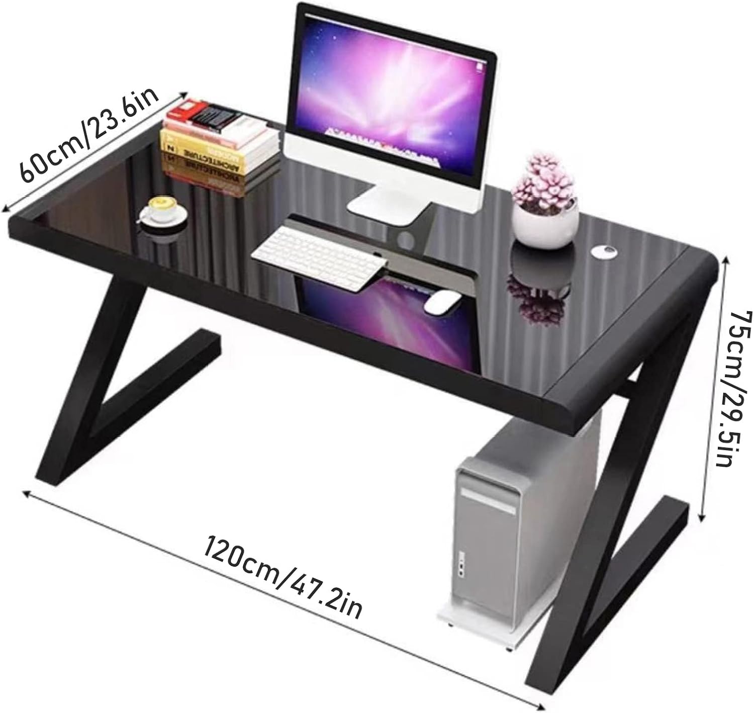 Computer Desk Study Writing Desk Laptop Table Sturdy Glass Desk with Black Pedestal Metal FrameWith its open-concept design and clean aesthetic, this contemporary computer desk makes a perfect addition to any home office or work space. The metal frame and track-style legs ensure robust stability, sturdy enough to support an all-in-one computer, the tempered glass tabletops are very easy to clean.SPECIFICATIONSMaterial: Tempered Glass & Thicker SteelPackagel: 1 x Office Desk MULTI-USEThis office table can be used as a study desk, writing desk, computer desk, gaming desk, and more. No matter you want to work on here, play computer games or study on there, this great desk will accompany you complete your job perfectly.THICKENED METALUltra-thick metal steel frame to provide the ultimate stability.QUALITY MATERIALPremium Tempered Glass-High strength, safe, elegant, this writing desk brightens your room.EASY TO INSTALLThe desk effortlessly within 5 mins!For a smooth assembly process, we suggest you keep a lite tightness for all the screws during assembly, after the whole desk is assembled, firmly tighten all the screws.