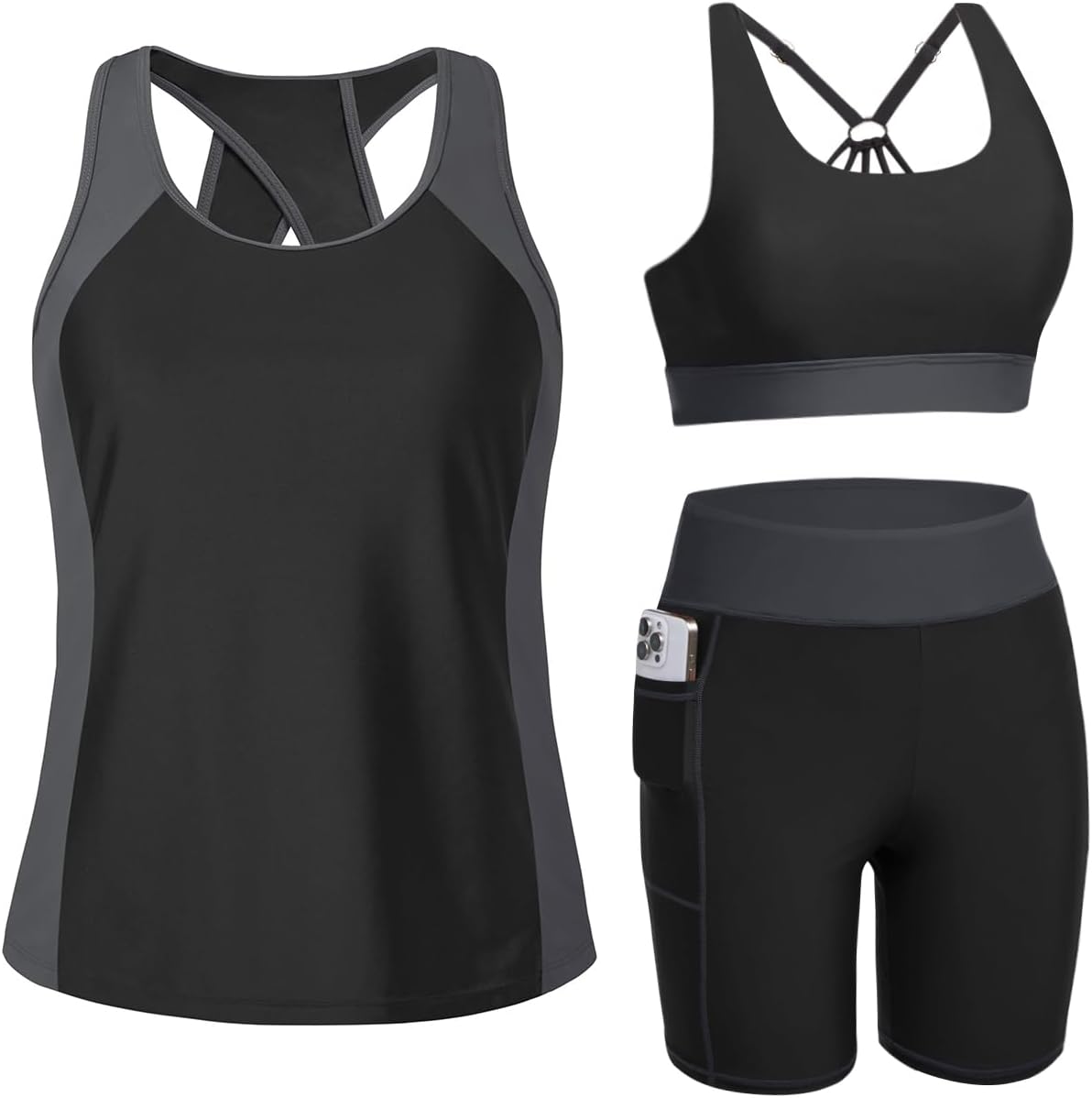 This vibrant color-block tankini set includes a tankini top, a bikini sport bra with removable pads, and 7-inch high-waisted shorts featuring side pockets.