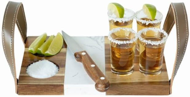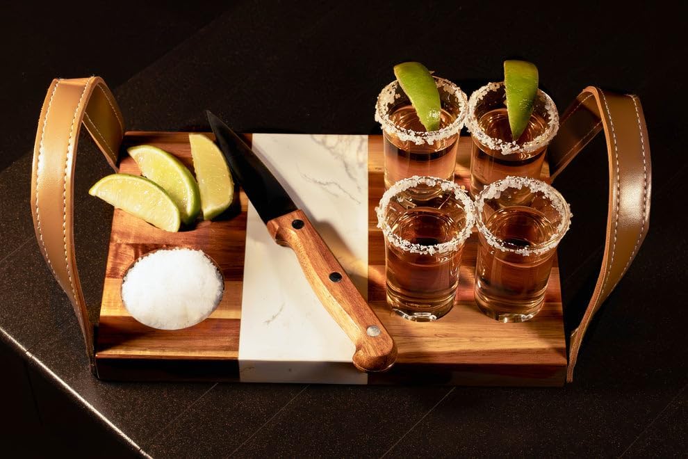 The 6-Piece Tequila Tasting Set is the ultimate choice for tequila lovers who appreciate quality and craftsmanship. This premium set includes a beautifully handcrafted acacia wood serving board, four high-quality shot glasses, a sleek marble cutting strip, and a stainless steel. Whether you're enjoying tequila with friends or hosting a special event, this set enhances your tasting ritual with style and sophistication.