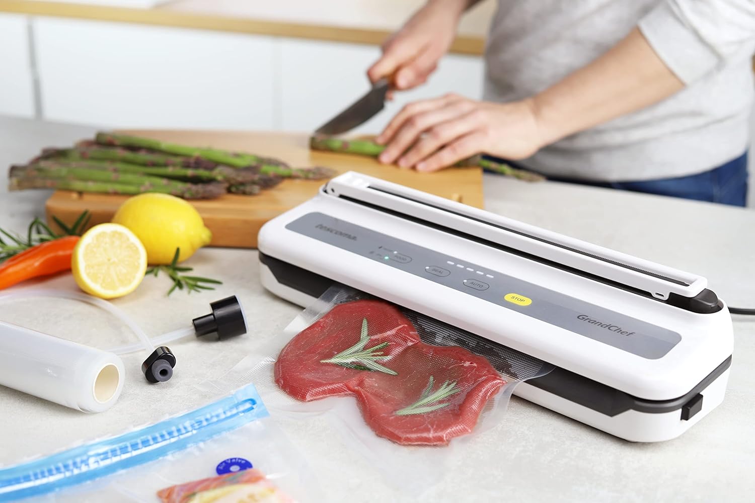 Excellent way to vacuum package food easily and quickly. Vacuum packaged food has a significantly longer durability, preserves its natural taste and can be prepared using the slow sous vide cooking technique. The vacuum sealer is suitable for vacuum packaging food in film rolls as well as in bags with zip lock. The built-in film cutter with anti-skid treatment is removable to enhance user comfort. It can be used directly in the vacuum sealer or separately on a flat surface. Vacuum sealer film roll 4FOOD 20 x 300 cm is enclosed.