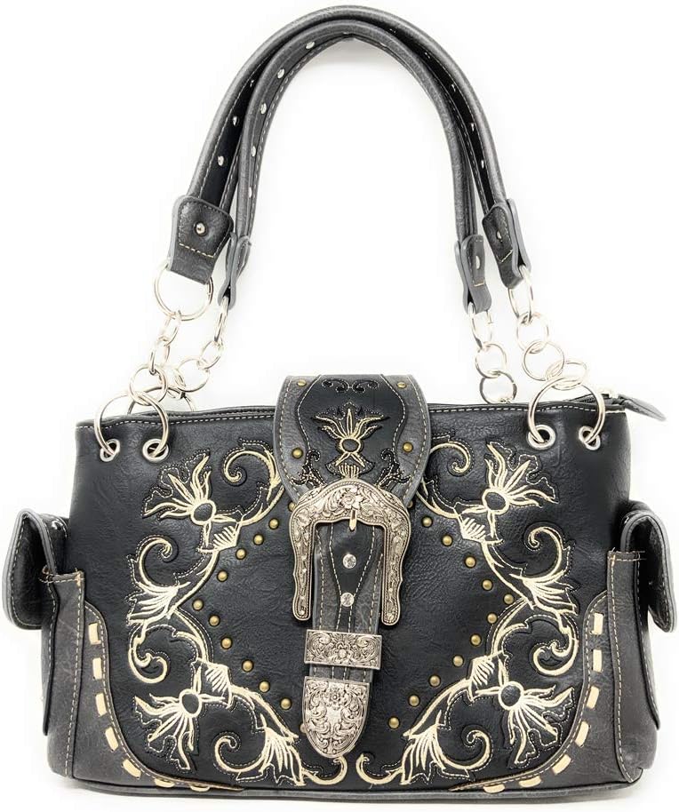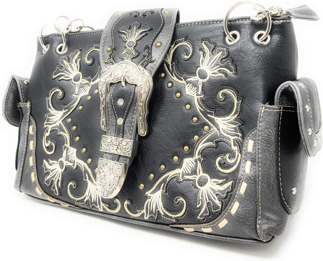 Step into Western elegance with this Texas West women's shoulder handbag and wallet set in vibrant multi-color. The handbag features a stunning rhinestone buckle and intricate embroidery, perfectly complemented by its matching wallet. Measuring 13" x 8.25" x 5", this messenger-style bag offers ample storage with multiple compartments including a dedicated cell phone pocket, interior zipper pocket.The coordinating wallet (7.5" x 4.5" x 1.5") comes equipped with 10 credit card slots, 2 ID windows, 3 bill compartments, and a checkbook holder. Crafted with durable PU leather and featuring a chain strap, this animal print handbag combines style with functionality. The set showcases classic Western aesthetics with a horse theme, making it a perfect accessory for any season. Both pieces feature secure zipper closures and thoughtfully organized compartments to keep your essentials within easy reach.