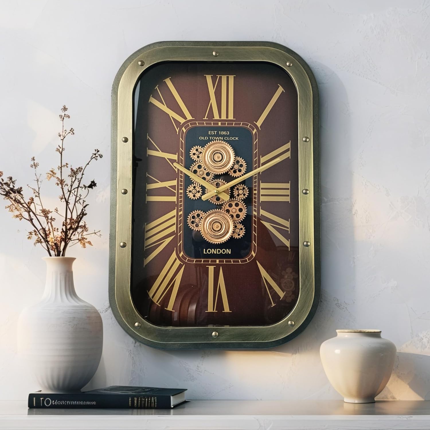 The Gears Clock 25X17'' Inch Real Moving Gear Wall Clock Rectangular NORWAY Line "DRAMMEN" (25X17 inches (63X43 cm)) MOVING GEAR: hypnotic motion; a living focal point for living room, entry, office. STYLE: industrial-modern; Metal golden frame, golde bezel; glass cover. QUALITY: high-grade components; quiet quartz movement. MATERIAL: metal bezel hands; engineered-polymer gears; metal frame; high-resistance glass. BATTERY: 3×AA required (NOT INCLUDED). DIMENSION: (INCH) 25 X 17 in × 3.35 in ; - CM (63 X 43 cm) (8.5 cm); WEIGHT 15.88 lb (7.2 kg); MOUNTING: hook pre-installed; use suitable wall anchors (hardware not included). GLASS: Yes—high-quality protective cover.