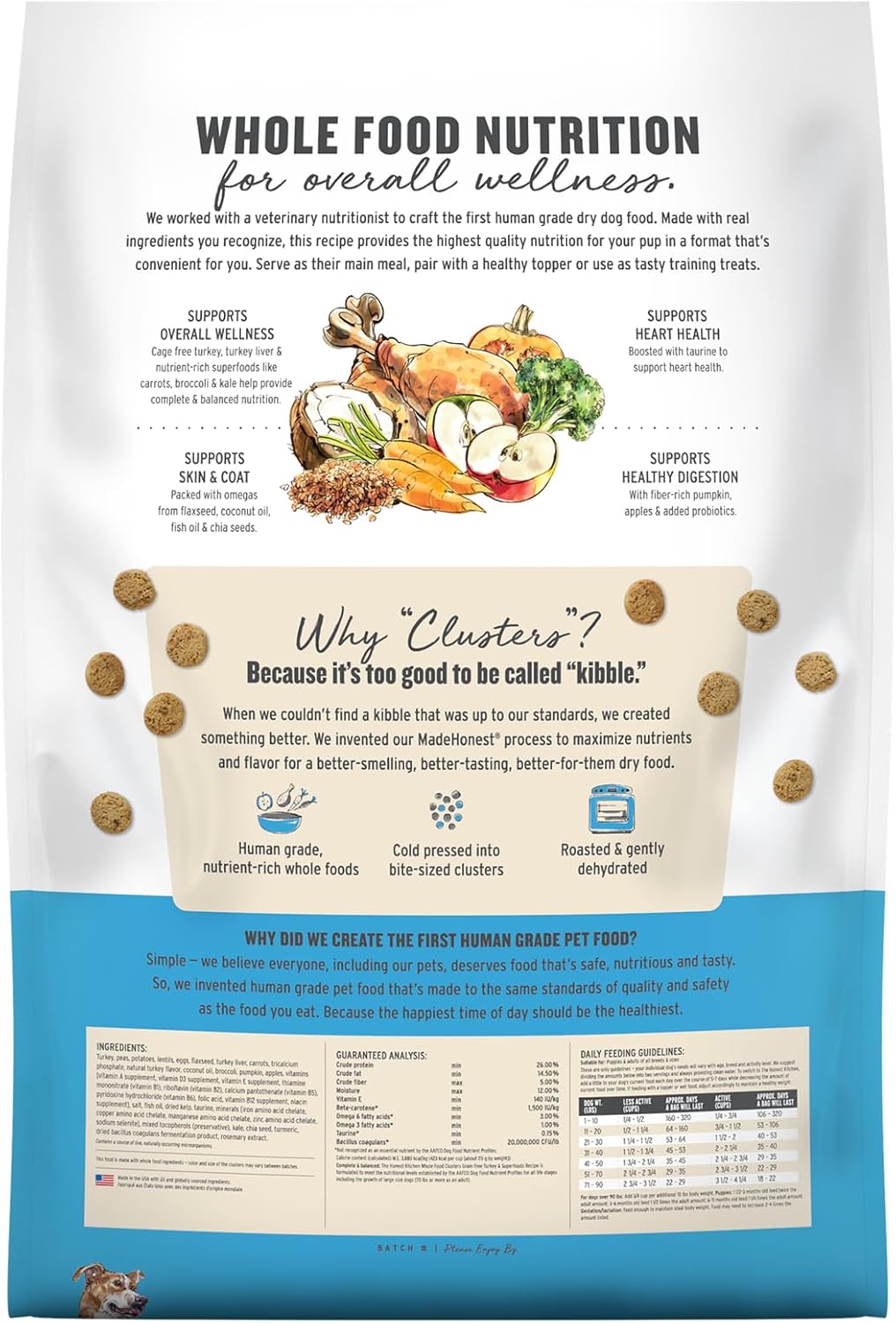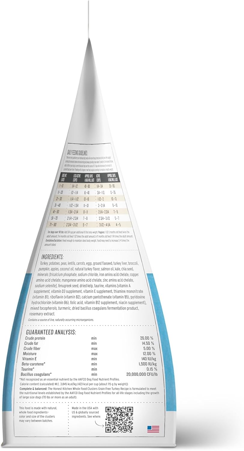 Crafted from a 100% human grade recipe using ingredients produced in a certified human food facility, this premium dog food ensures the highest quality for your pup. Each satisfying bite contains a carefully balanced mix of muscle meat, liver, oats, and healthy fats, combined with live probiotics for optimal digestion. Suitable for adult dogs of all breeds, this dry dog food is devoid of feed grade ingredients, fillers, and artificial preservatives. Our minimally processed clusters are cold-pressed and gently dehydrated to retain the nutrients and flavors that your dog craves. Enjoy the peace of mind that comes from knowing you are feeding your beloved pet the best—the Honest Kitchen dog food is designed to meet your health-conscious standards while delivering a nutritious and delicious meal. Elevate your dog’s dining experience with Whole Food Clusters, where every ingredient is selected for its quality and purpose. Transform mealtime into a wholesome and enjoyable journey for your dog with The Honest Kitchen—because your pet deserves nothing less than honest, natural food.